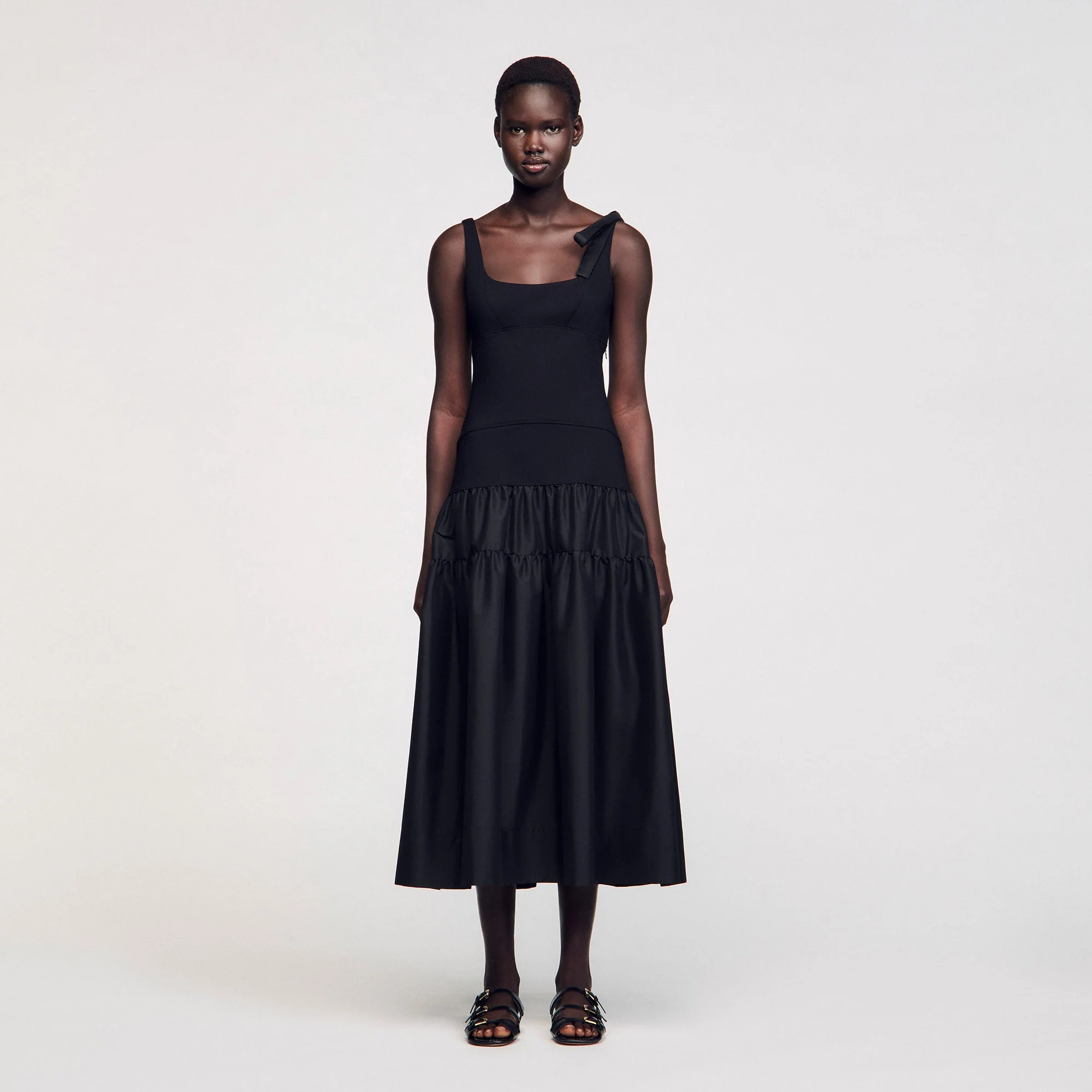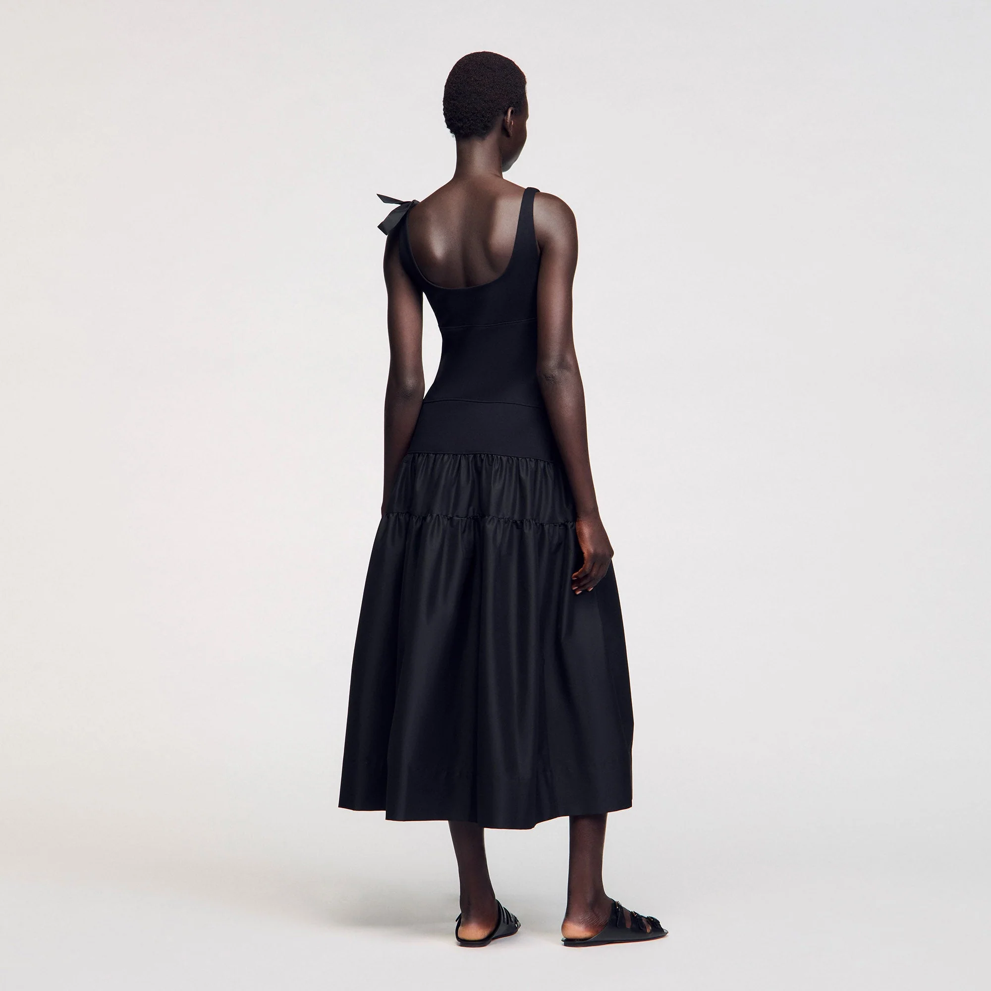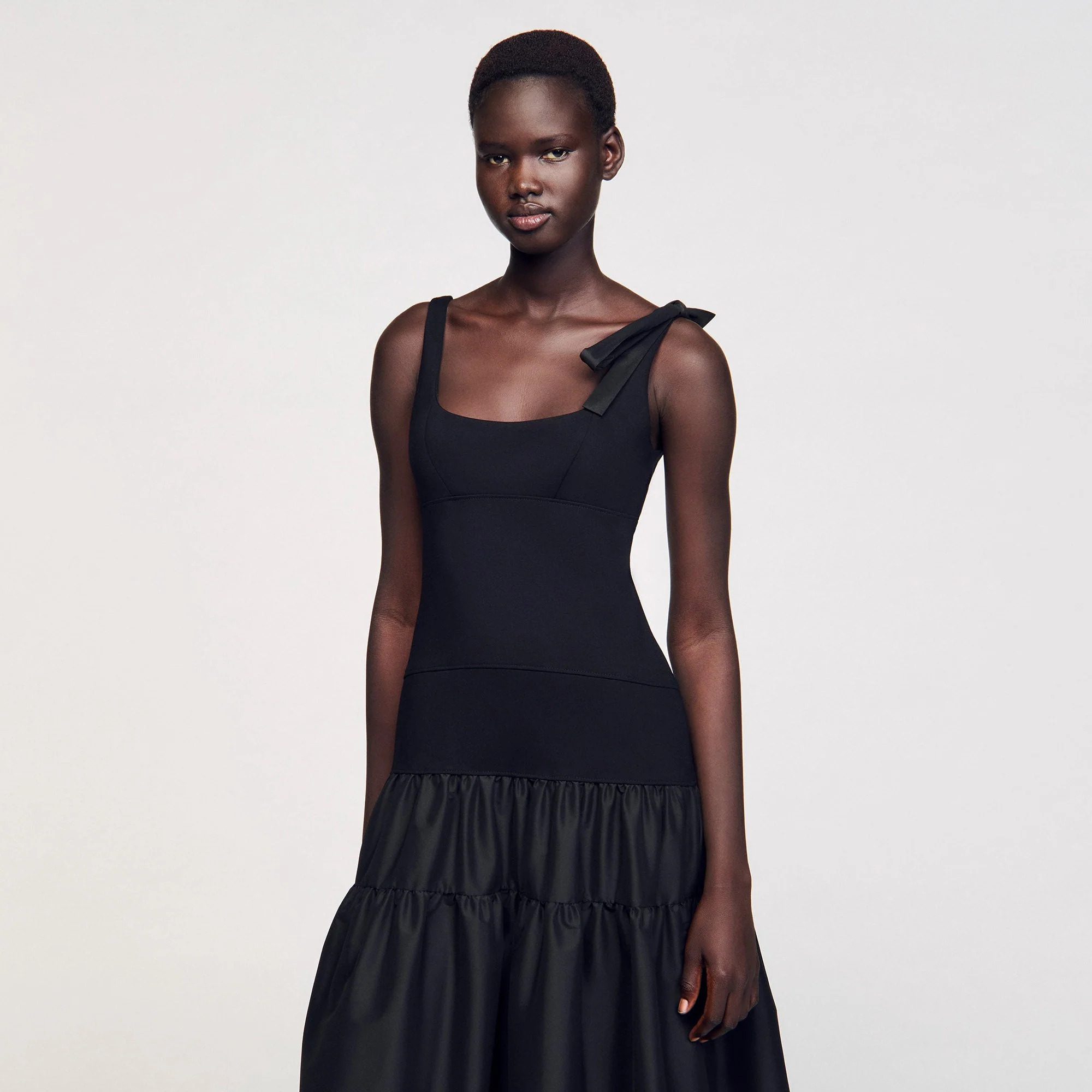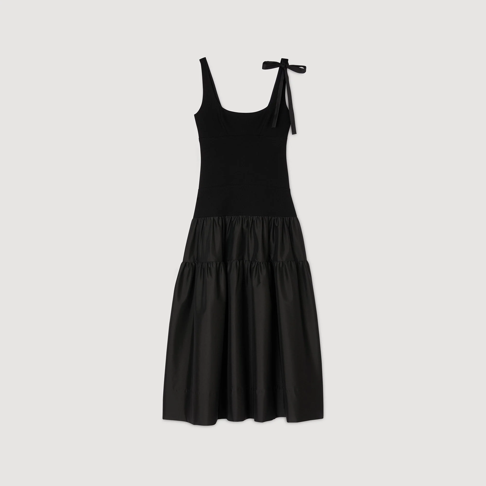 Vestido largo de dos materiales con parte superior tipo camiseta de tirantes con lazo y falda de tafetán con volumen.