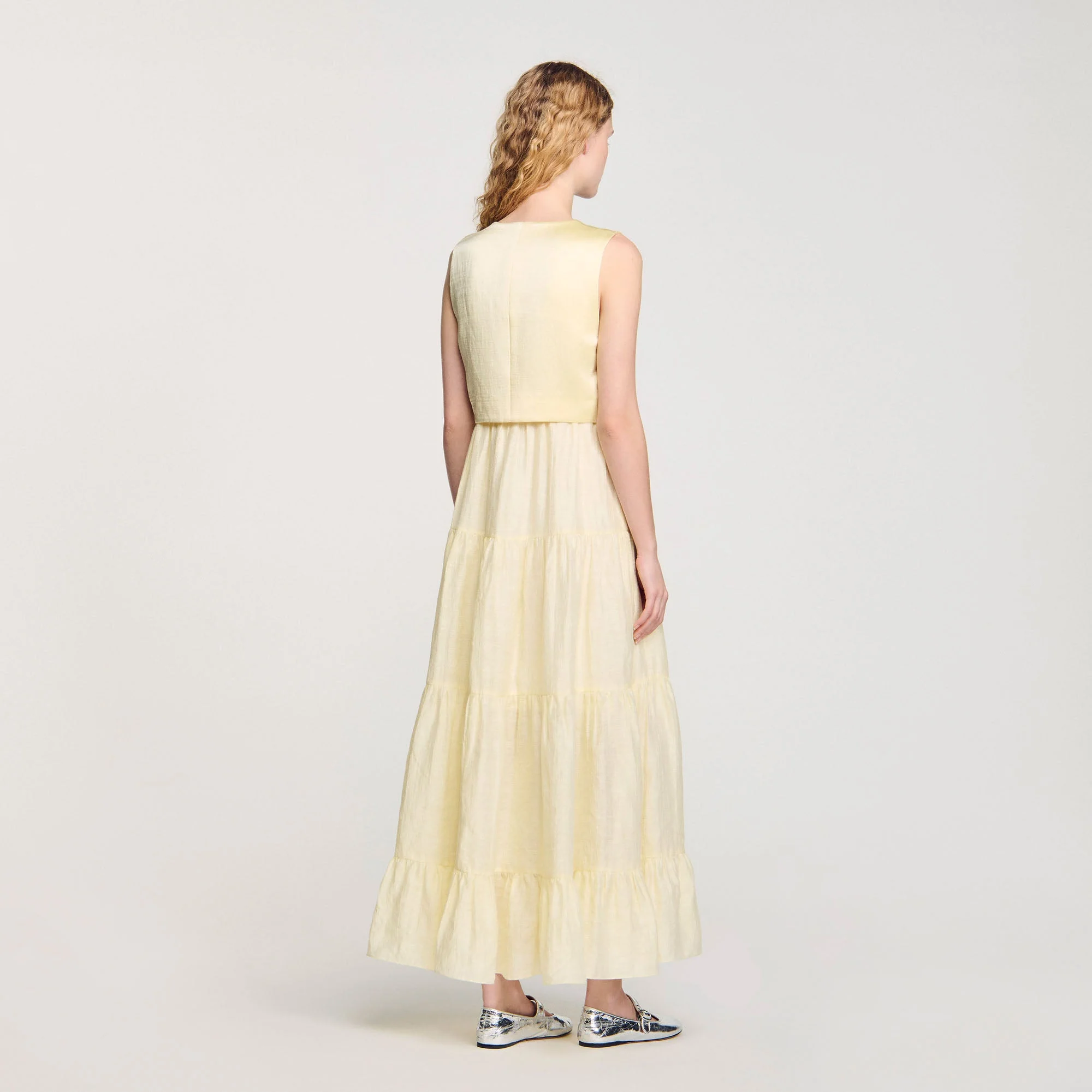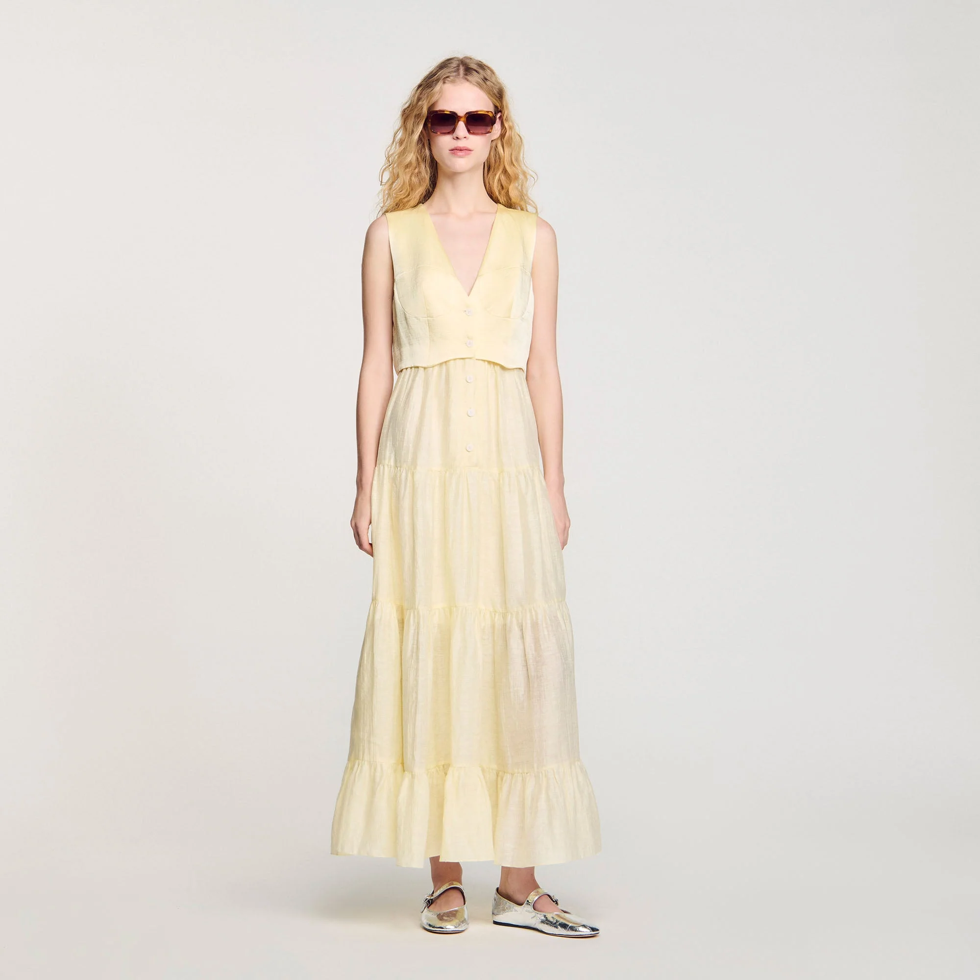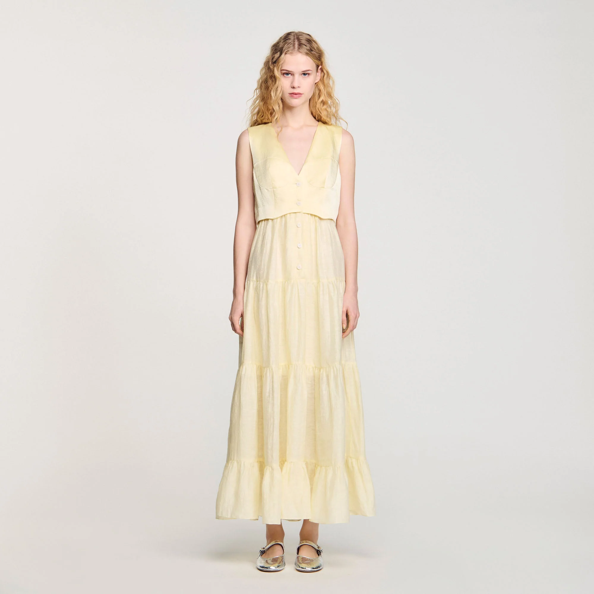 Vestido largo de lino con parte superior abotonada tipo chaleco con costuras estilo corsé y falda acampanada con volante en el bajo.