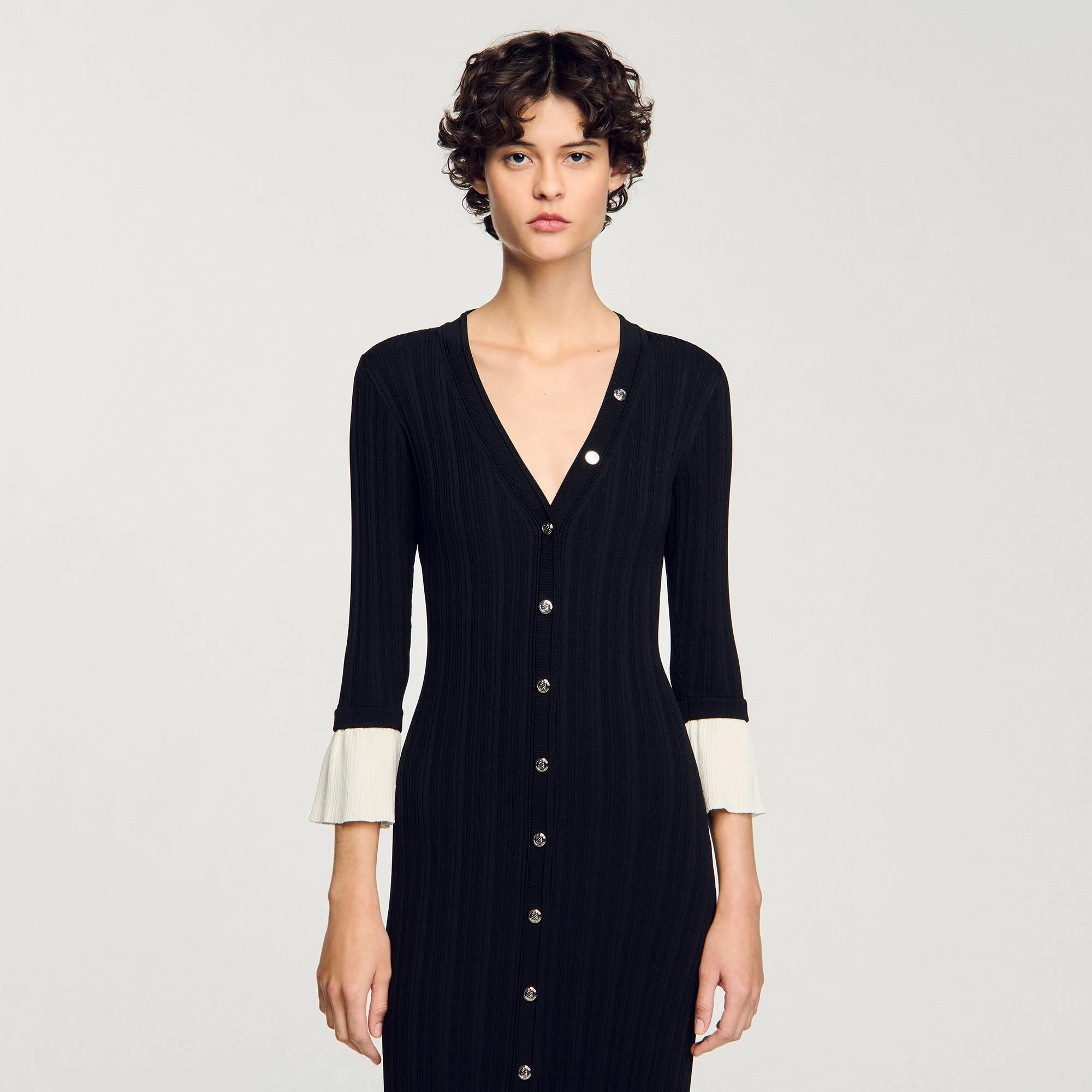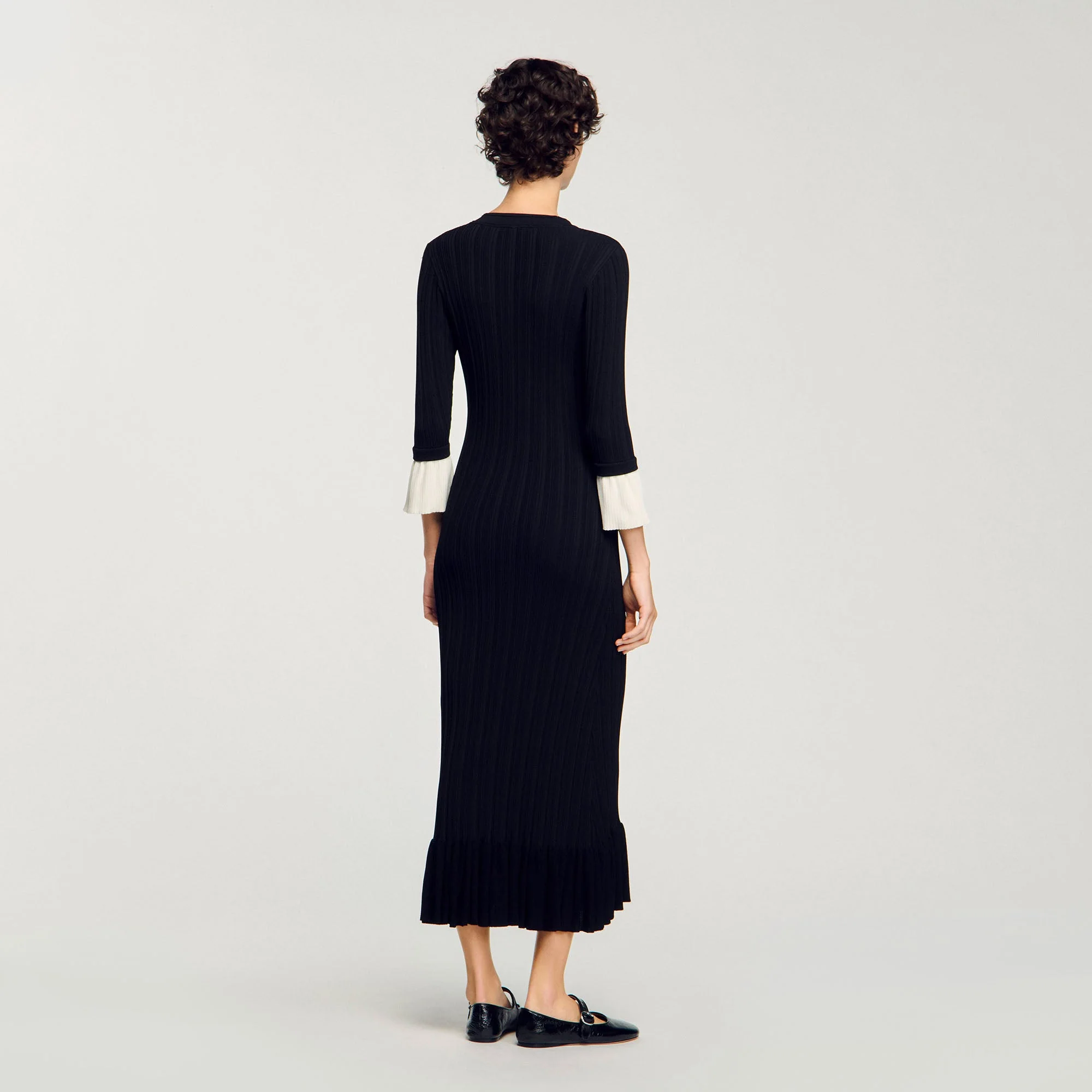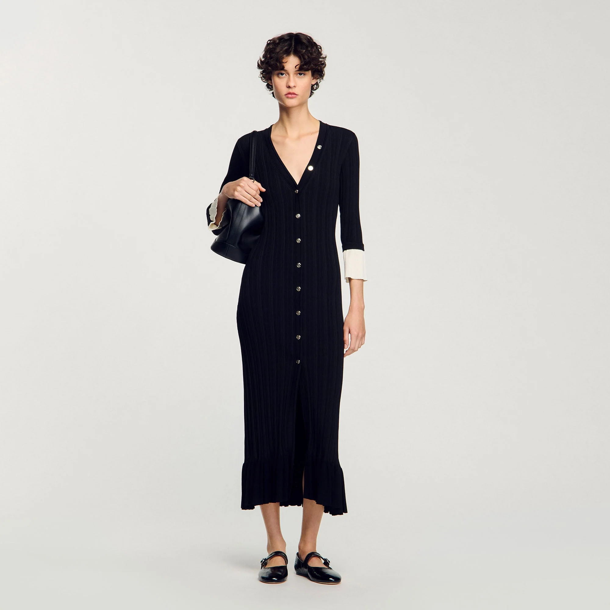 Vestido largo de punto con escote de pico, mangas con volantes en contraste en los puños, bajo con volante y tapeta de botones.