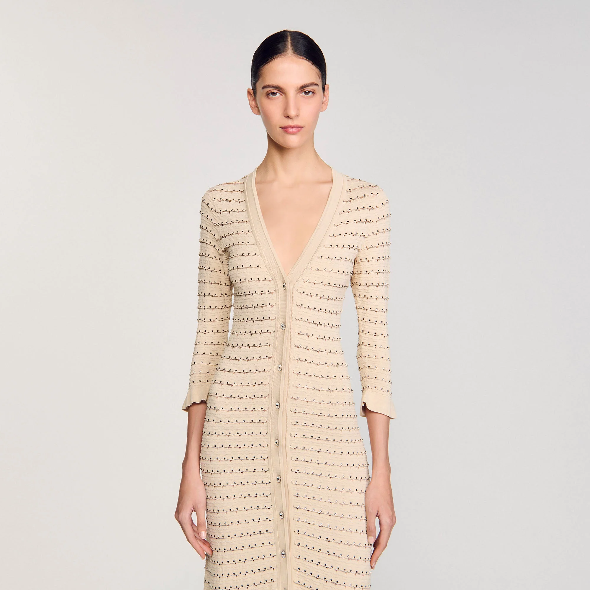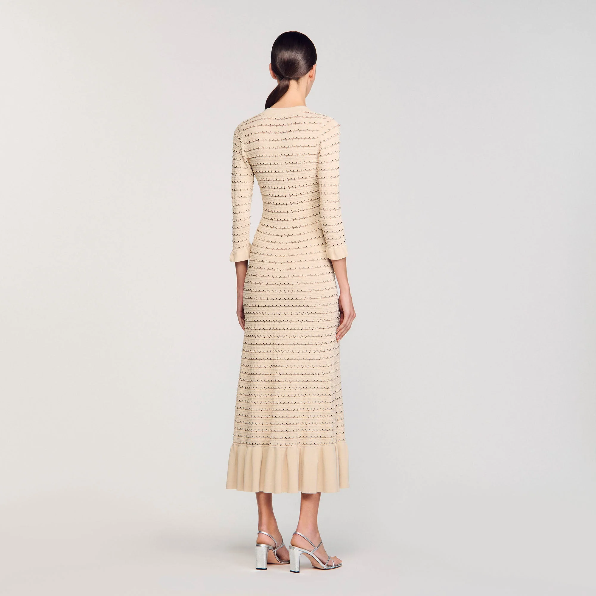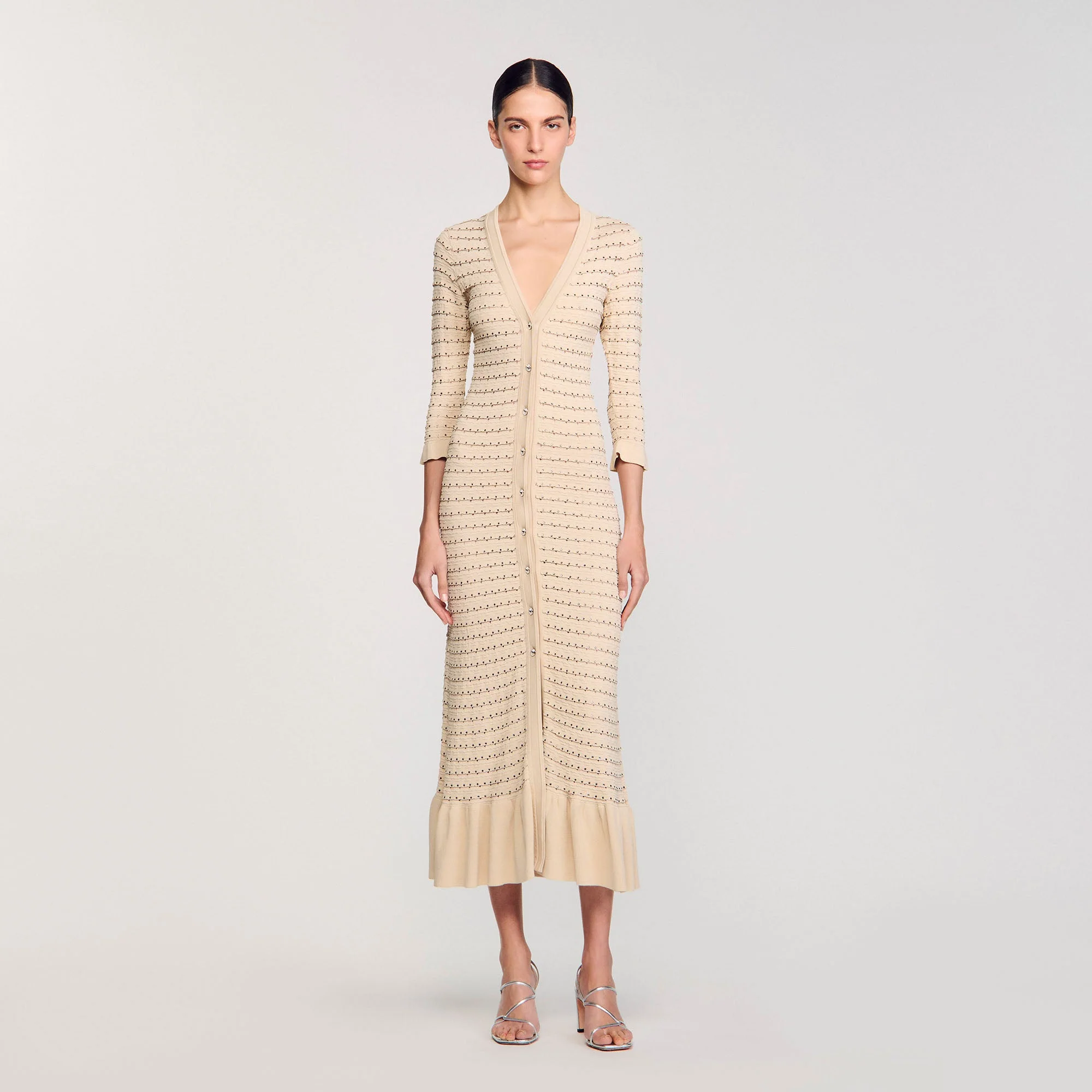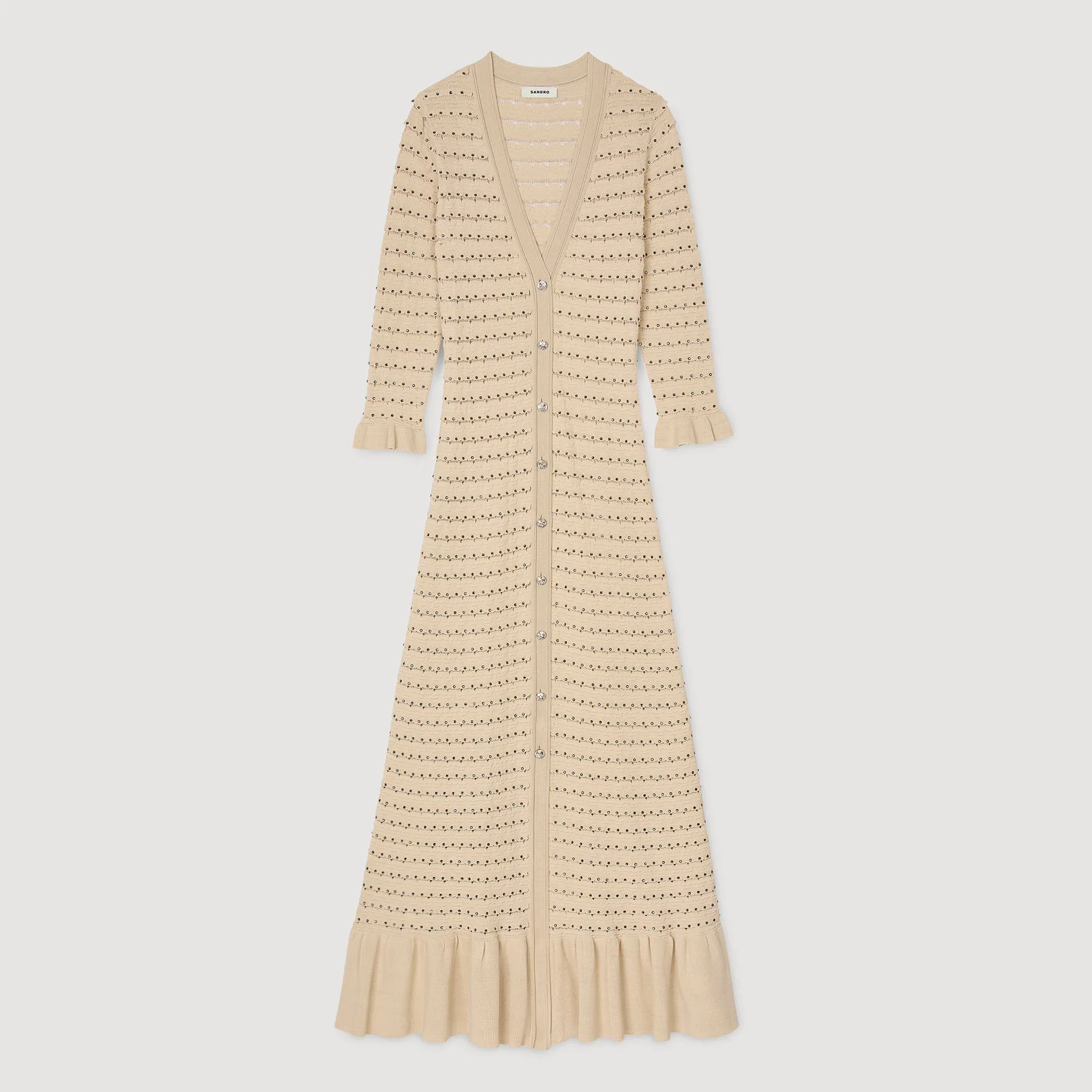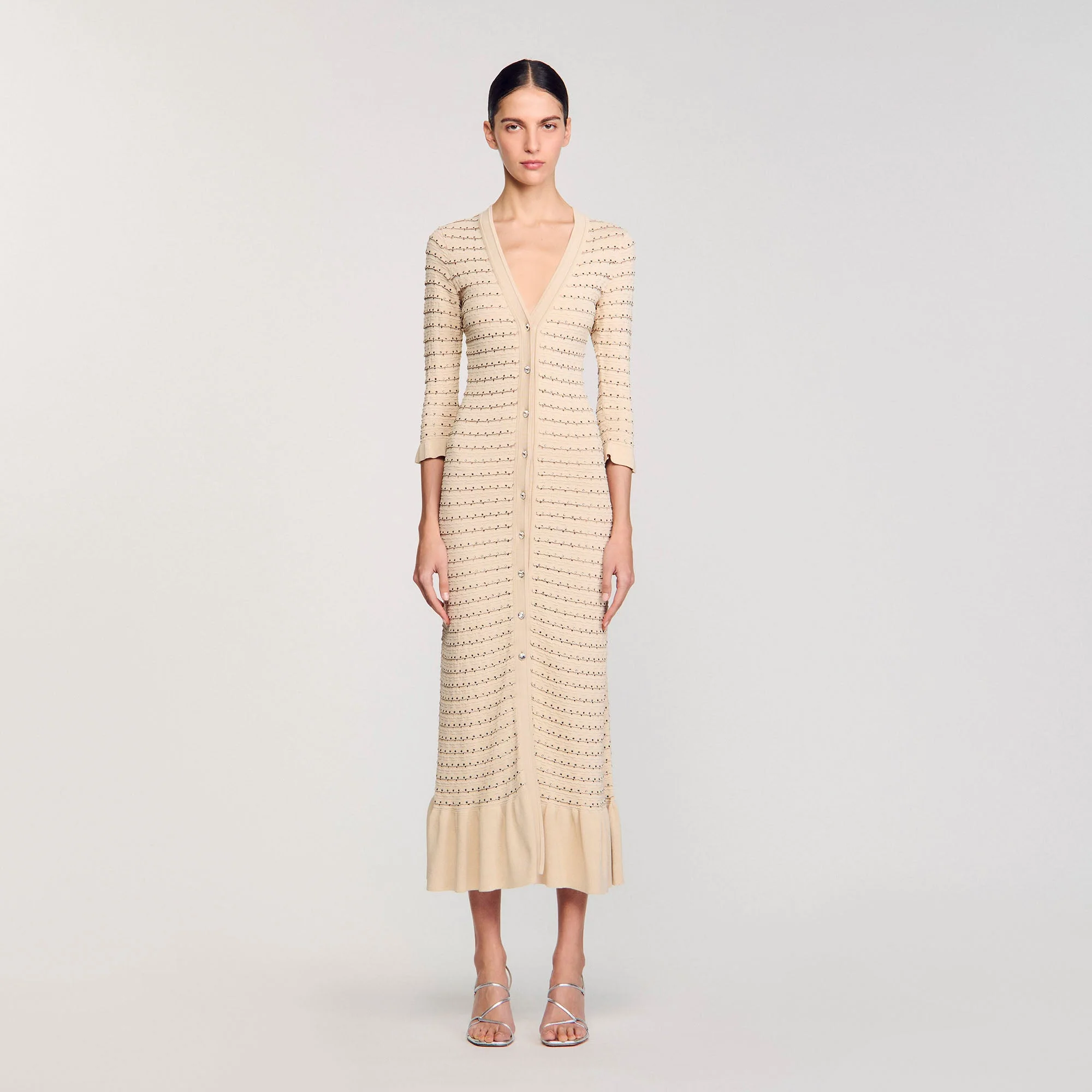 Vestido largo de punto de fantasía con detalle de strass all over, escote pronunciado, cierre de botones y volante en el bajo.