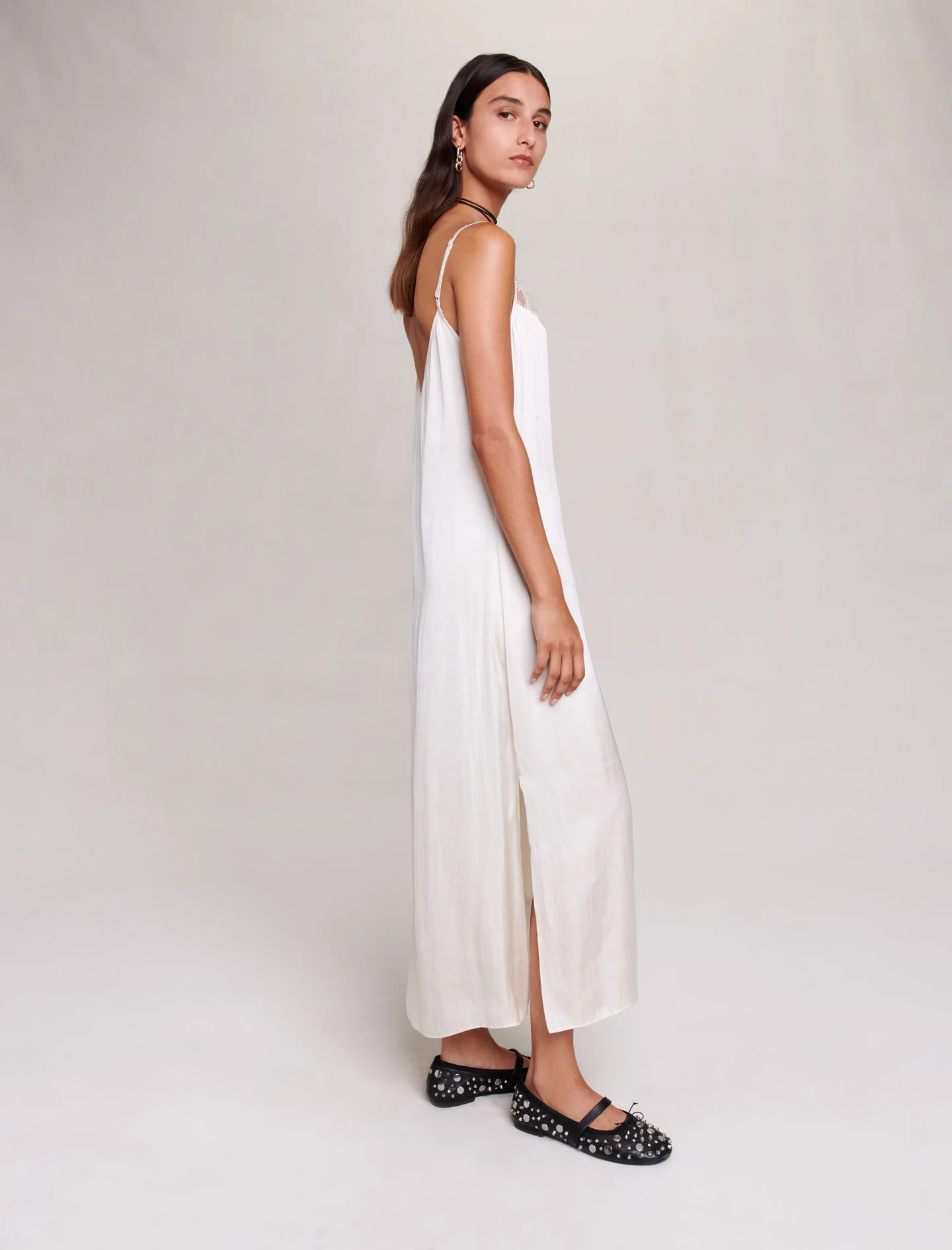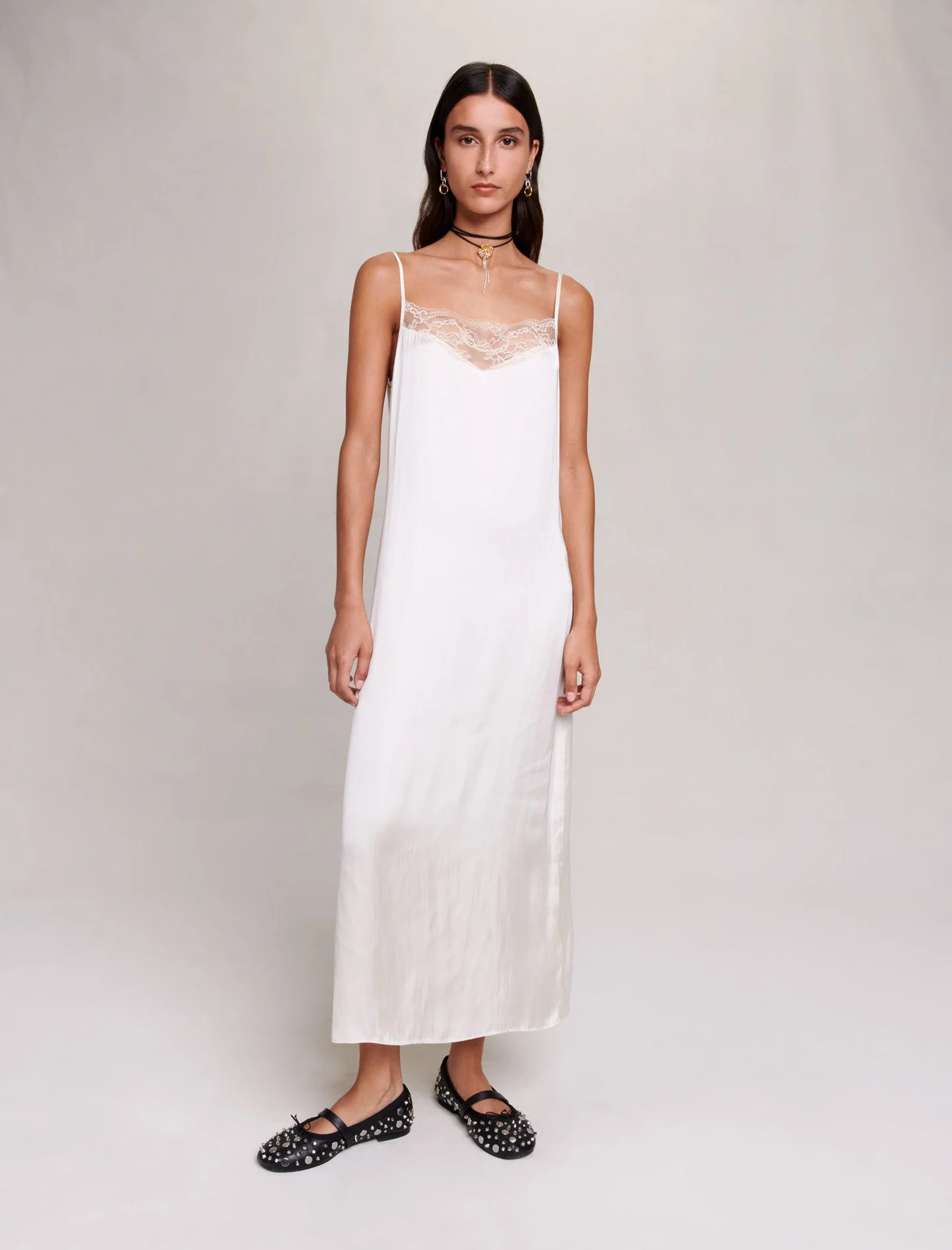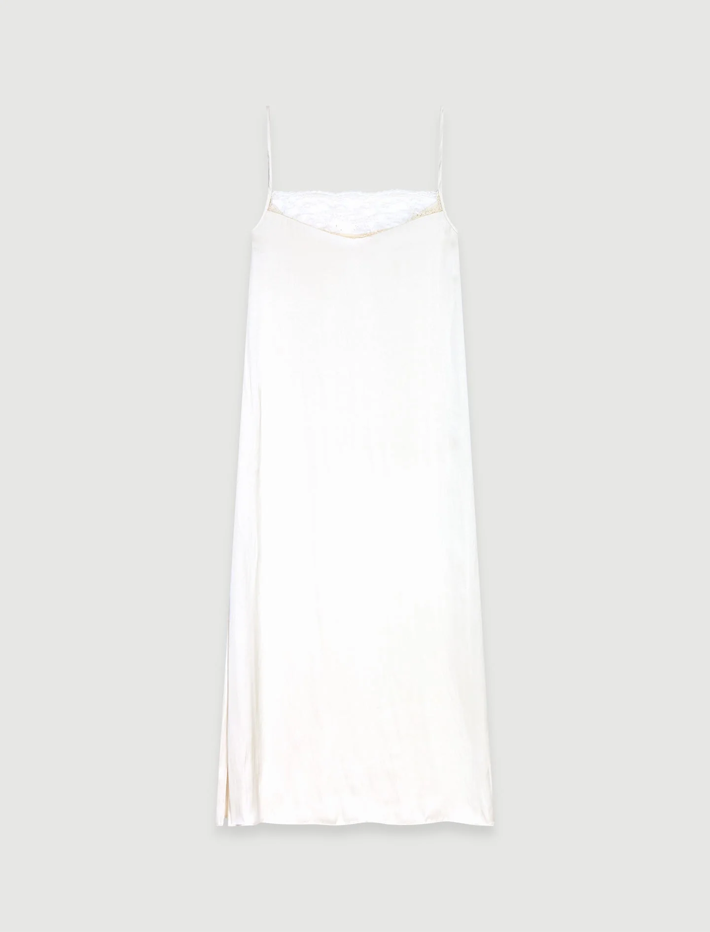 La nueva colección de Maje celebra el estilo preppy romántico y combinado con la elegancia británica. Los clásicos se reinventan con un toque de libertad inspirado en la moda inglesa y realzado por unos tonos naturales.Apueste por la elegancia con este vestido largo de satén con efecto babydoll, que revela una silueta seductora, fluida y ligera. Dotado de unos tirantes finos y ajustables, un canesú transparente de encaje floral acentúa el escote. Intensamente elegante, desvela unas aberturas laterales.Puede llevarse de día o de noche, compleméntelo con unas joyas y unas bailarinas con tachuelas.Ref.: MFPRO03069El tejido principal de esta prenda está fabricado íntegramente con poliéster reciclado. Un nuevo hilo fabricado a partir de residuos plásticos o textiles, para una mayor circularidad.En Maje, imaginamos el futuro. Compartimos el objetivo de reducir, un poquito más cada temporada, el impacto en el medio ambiente de las prendas que diseñamos.