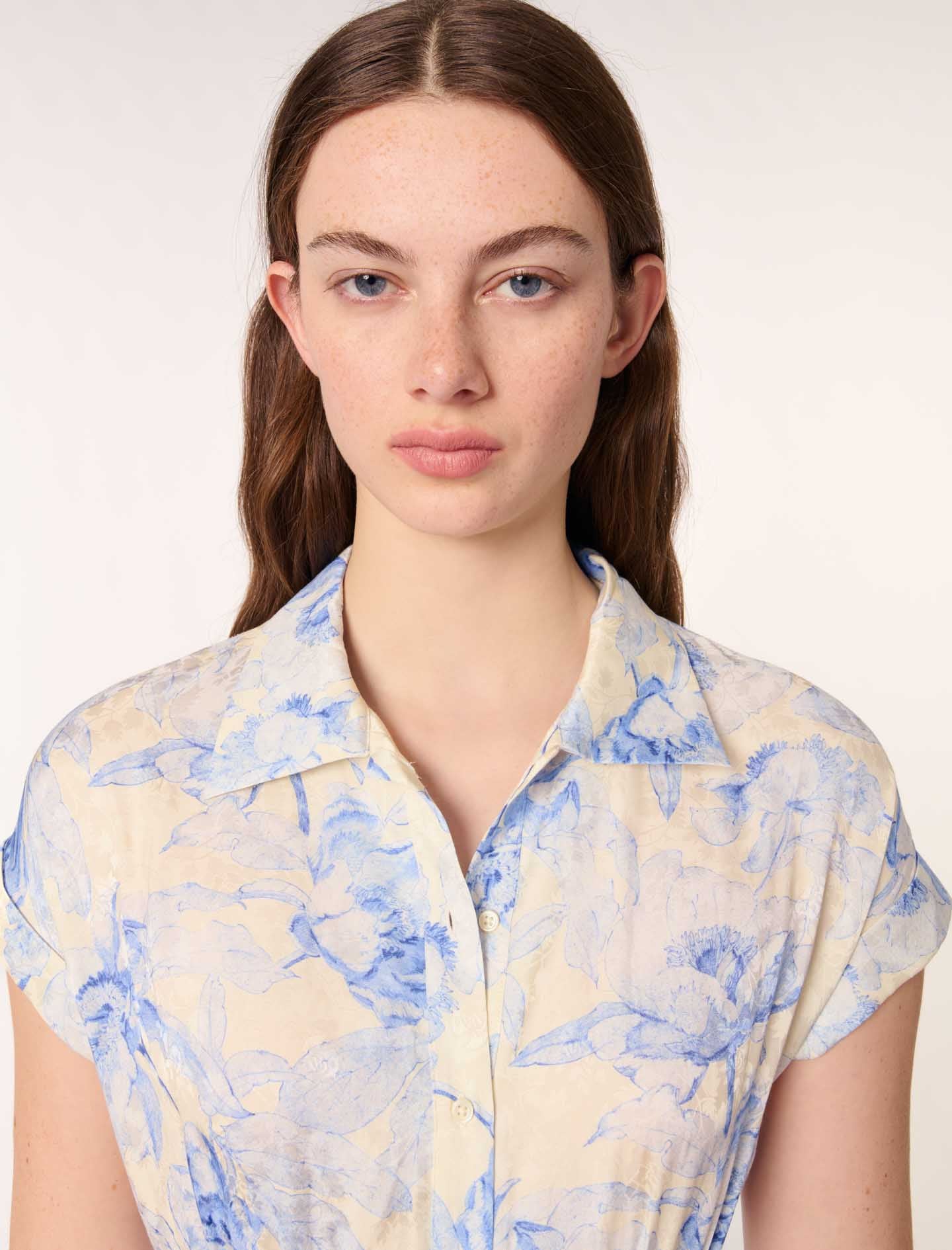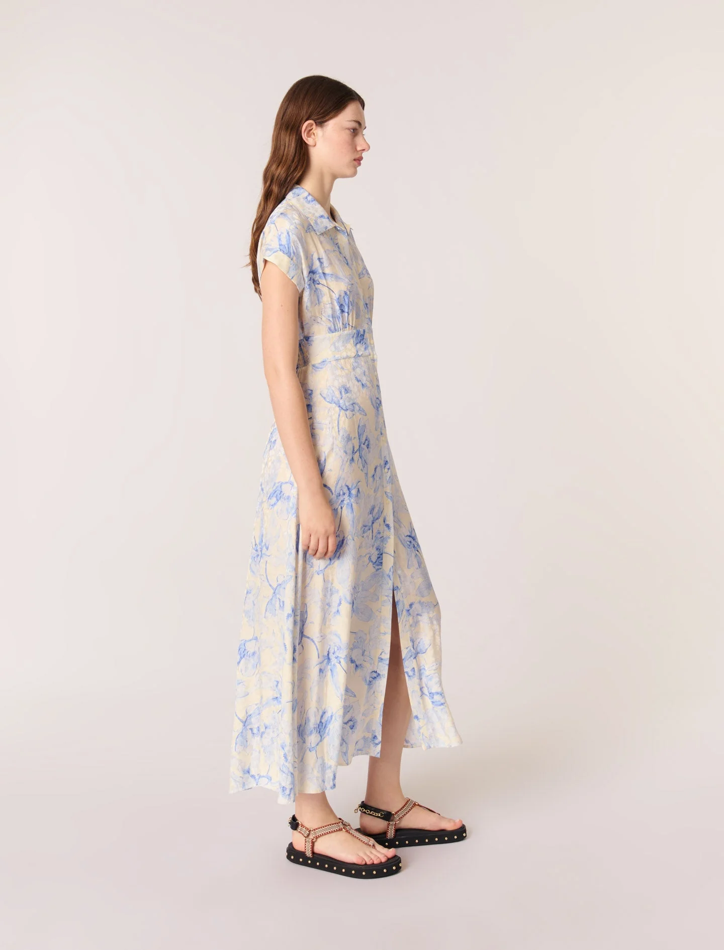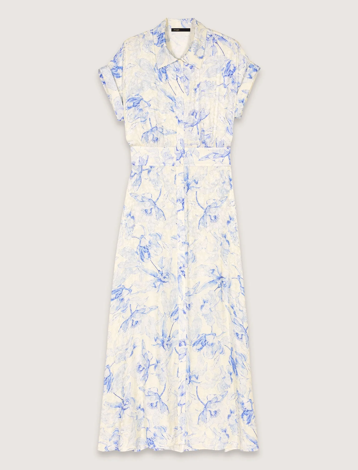 Confeccionado en tejido jacquard satinado, este vestido camisero largo presenta un estampado efecto acuarela en azul peonía. El cierre de botones y la banda fruncida con punto smock de la espalda realzan la cintura, mientras que la falda ligeramente acampanada aporta un toque femenino.
