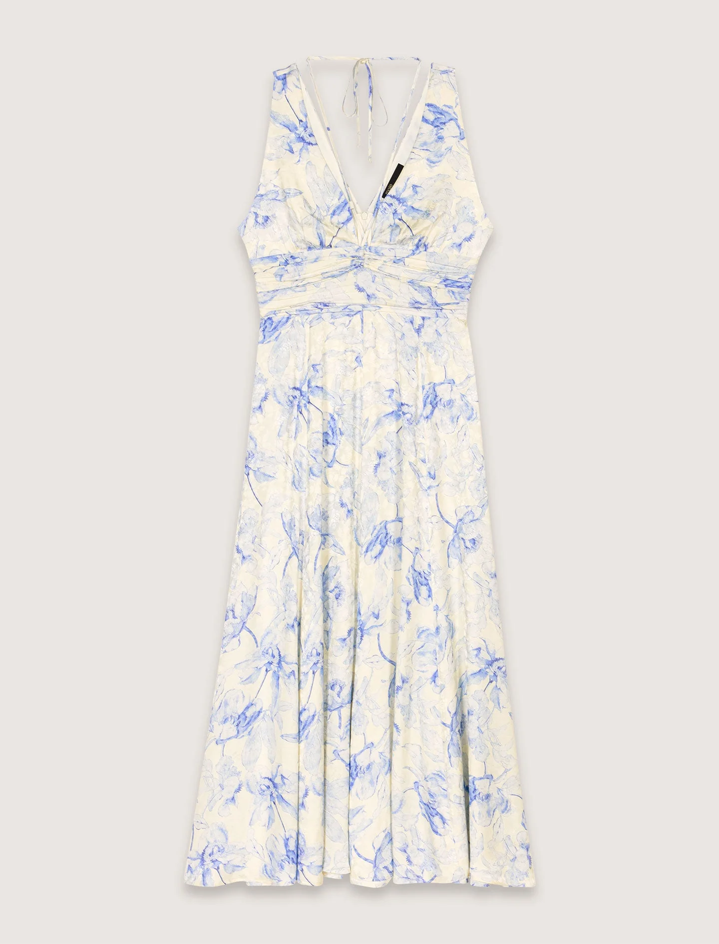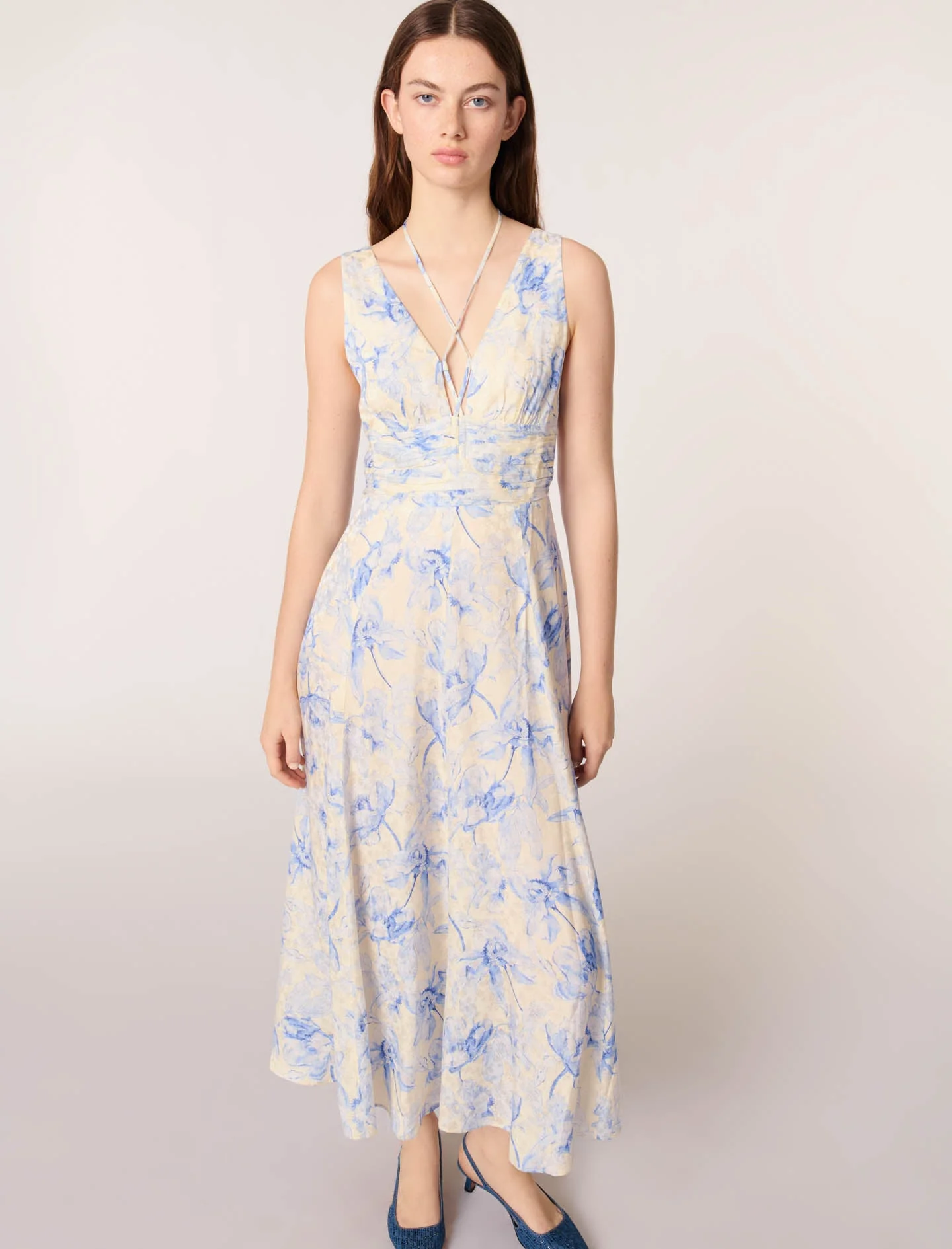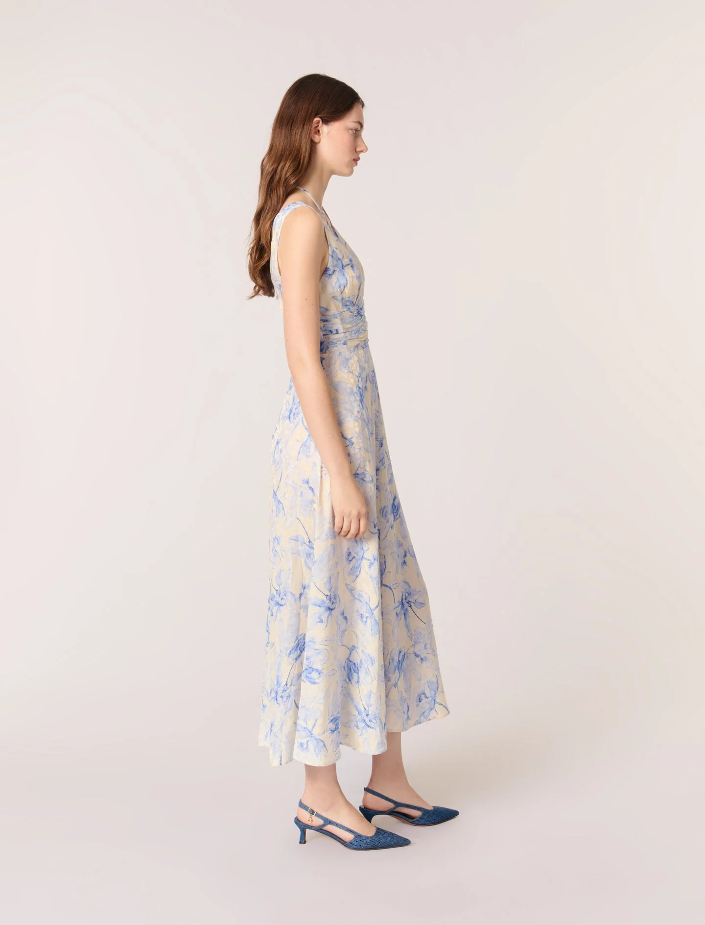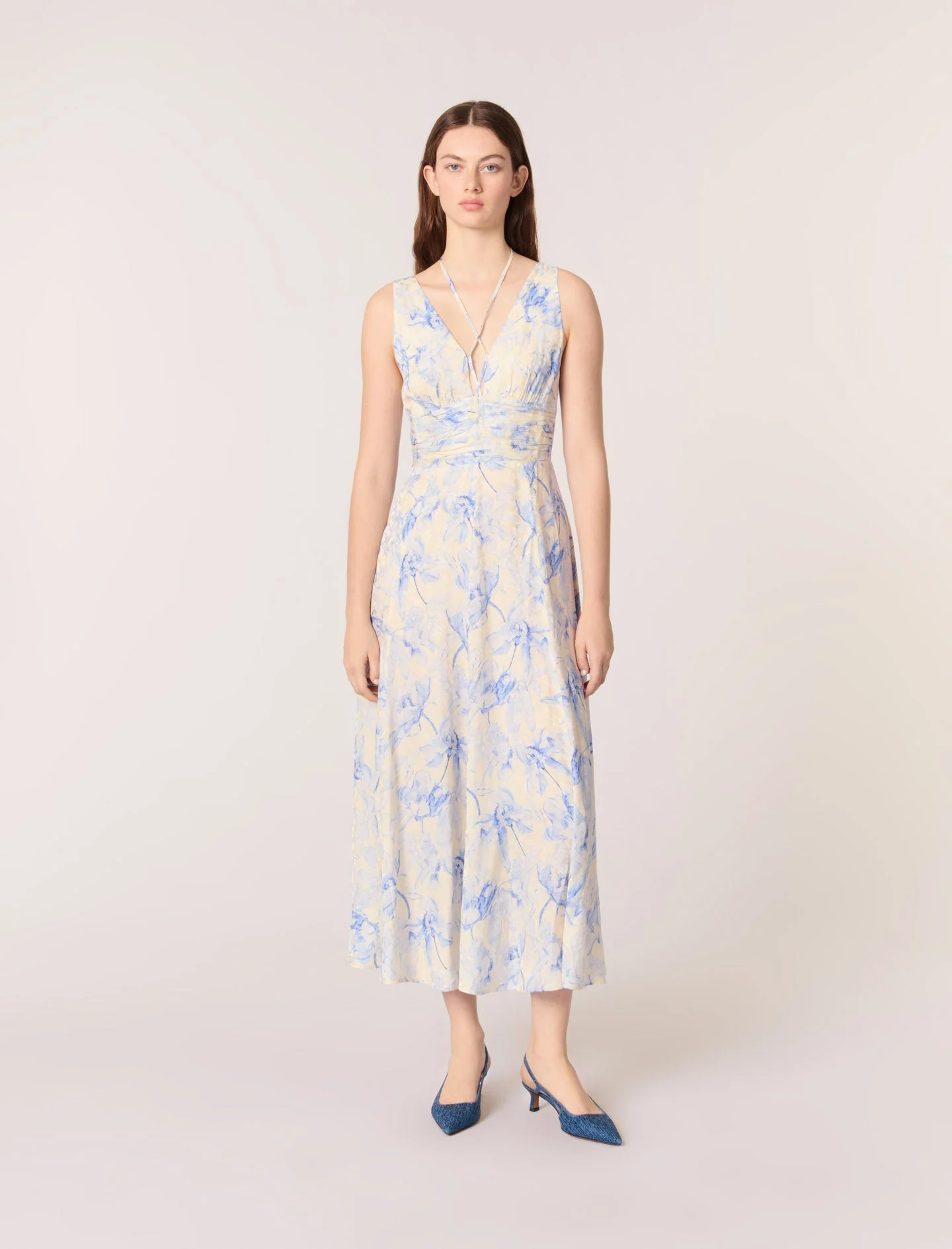 Este vestido largo en tejido jacquard satinado, una de nuestras prendas favoritas de la colección, presenta un estampado efecto acuarela en azul peonía. El escote y la espalda en V, subrayados por tirantes anchos y tiras corredizas, crean un bonito juego de aberturas. La cintura drapeada ajusta la silueta del vestido que presenta una caída ligeramente acampanada.