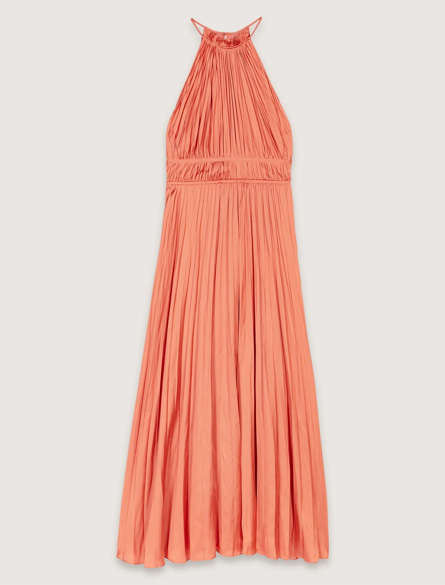 Este vestido largo seduce con su juego de pliegues y su caída fluida, creando un look vaporoso. Pequeños volantes bordean el cuello redondo, mientras que los lazos en la espalda realzan elegantemente la cintura.