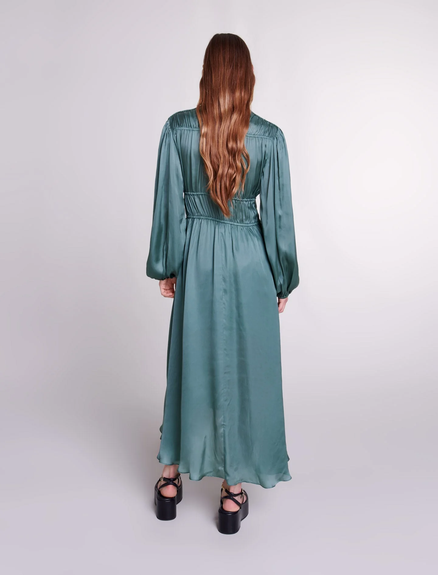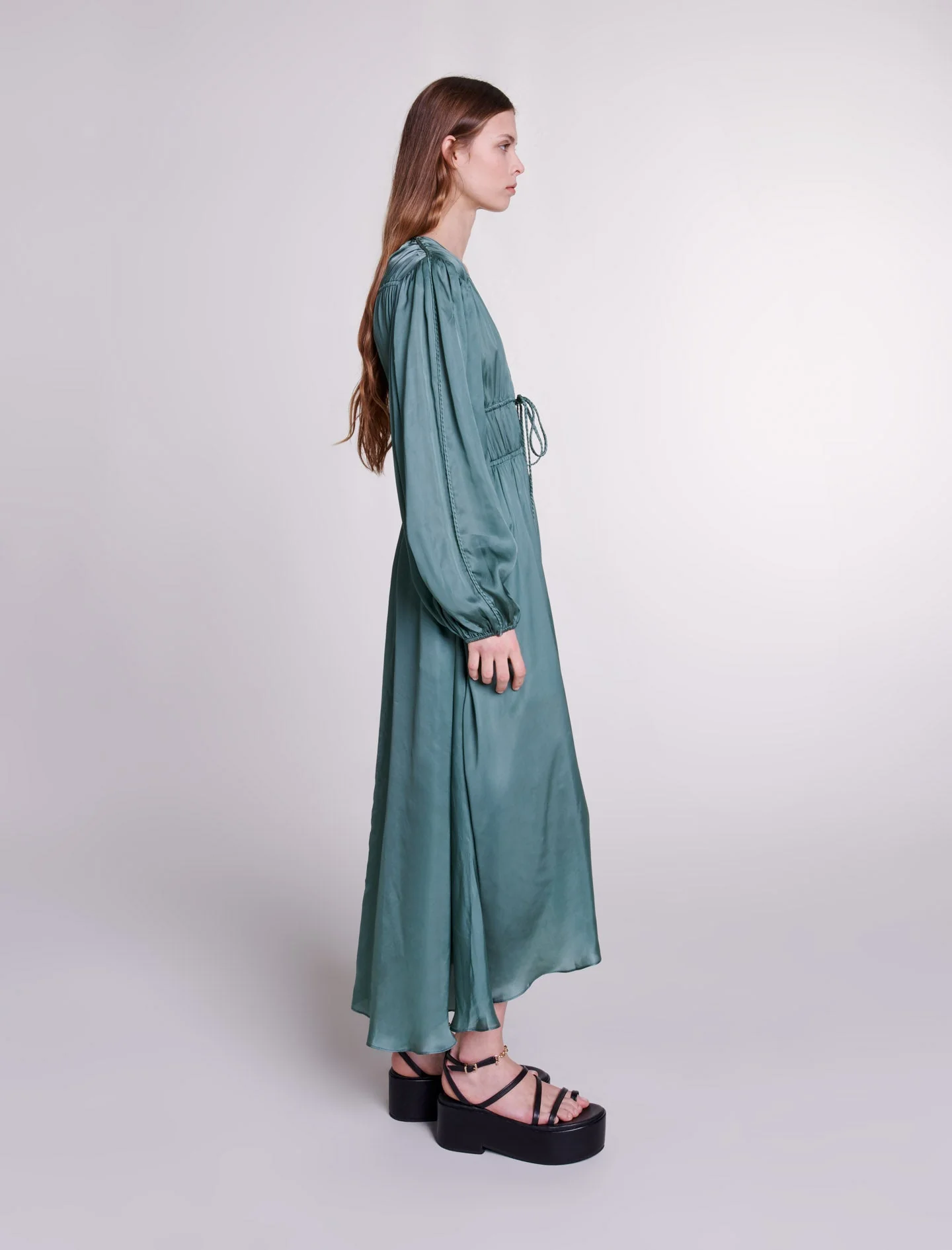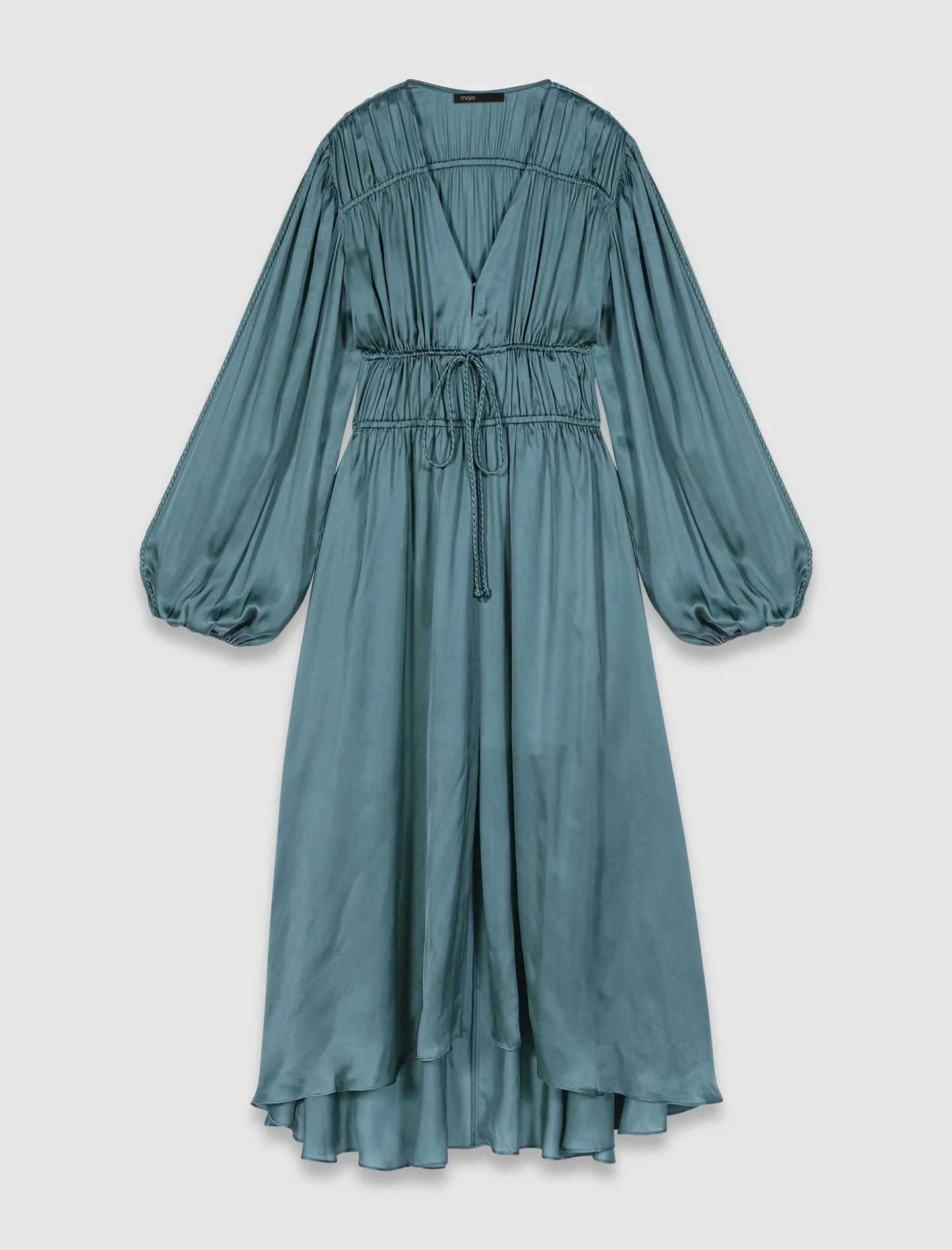 El estudio Maje celebra un vestuario de prendas atemporales con cortes atrevidos y detalles femeninos para realzar sus siluetas, de día y de noche.Este vestido largo, que resulta atractivo por sus detalles trabajados, está confeccionado en un tejido fluido y satinado. Dotado de puños con elástico, luce un escote en pico pronunciado, se ata con lazos en el cuello y en el pecho, y cuenta con detalles trenzados a lo largo de la manga larga.Esta prenda, ligeramente fruncida, ofrece una caída drapeada y asimétrica, marcada por una abertura en el centro.Ref.: MFPRO03514