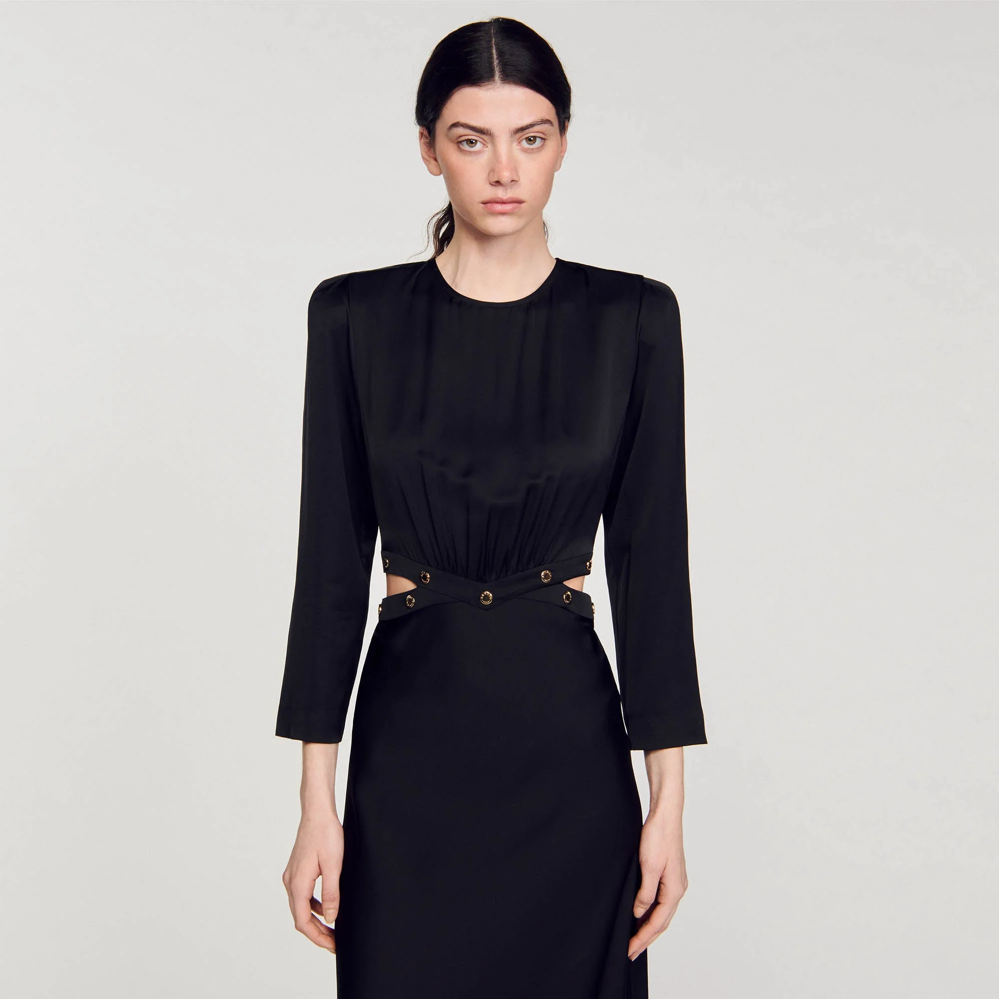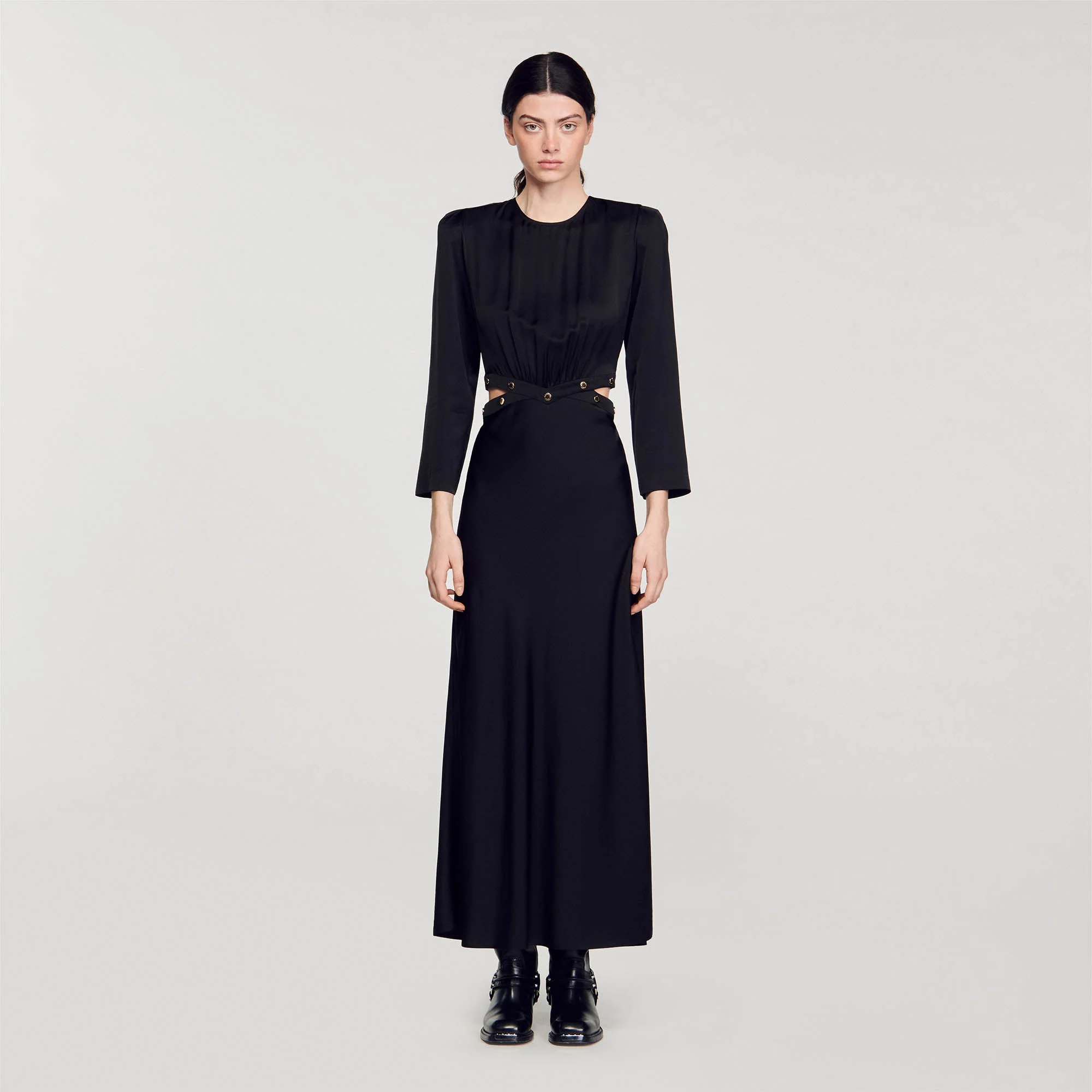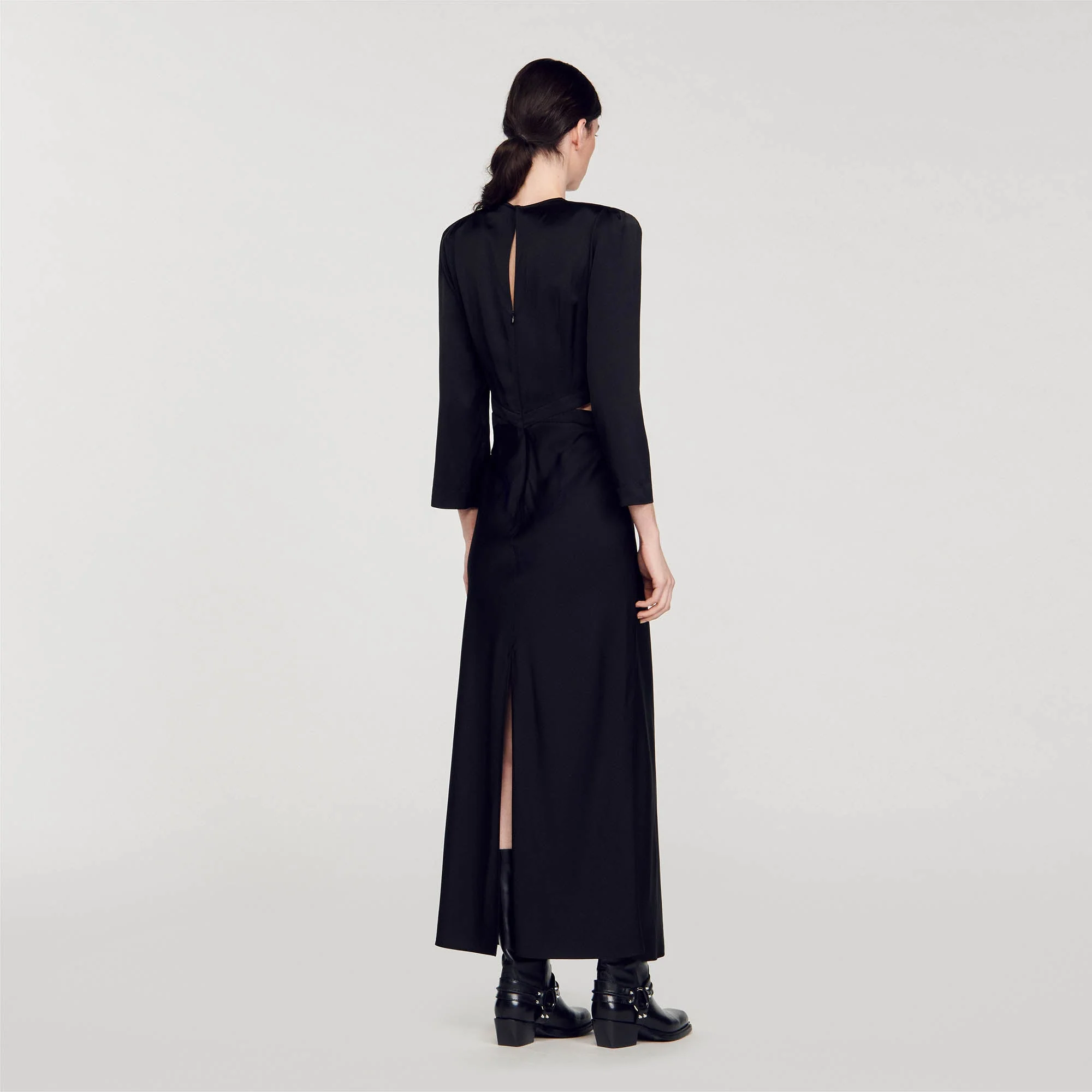 Vestido largo de satén y hombros con un cuello redondo, manga larga y corte calados en la cintura con botones plateados.