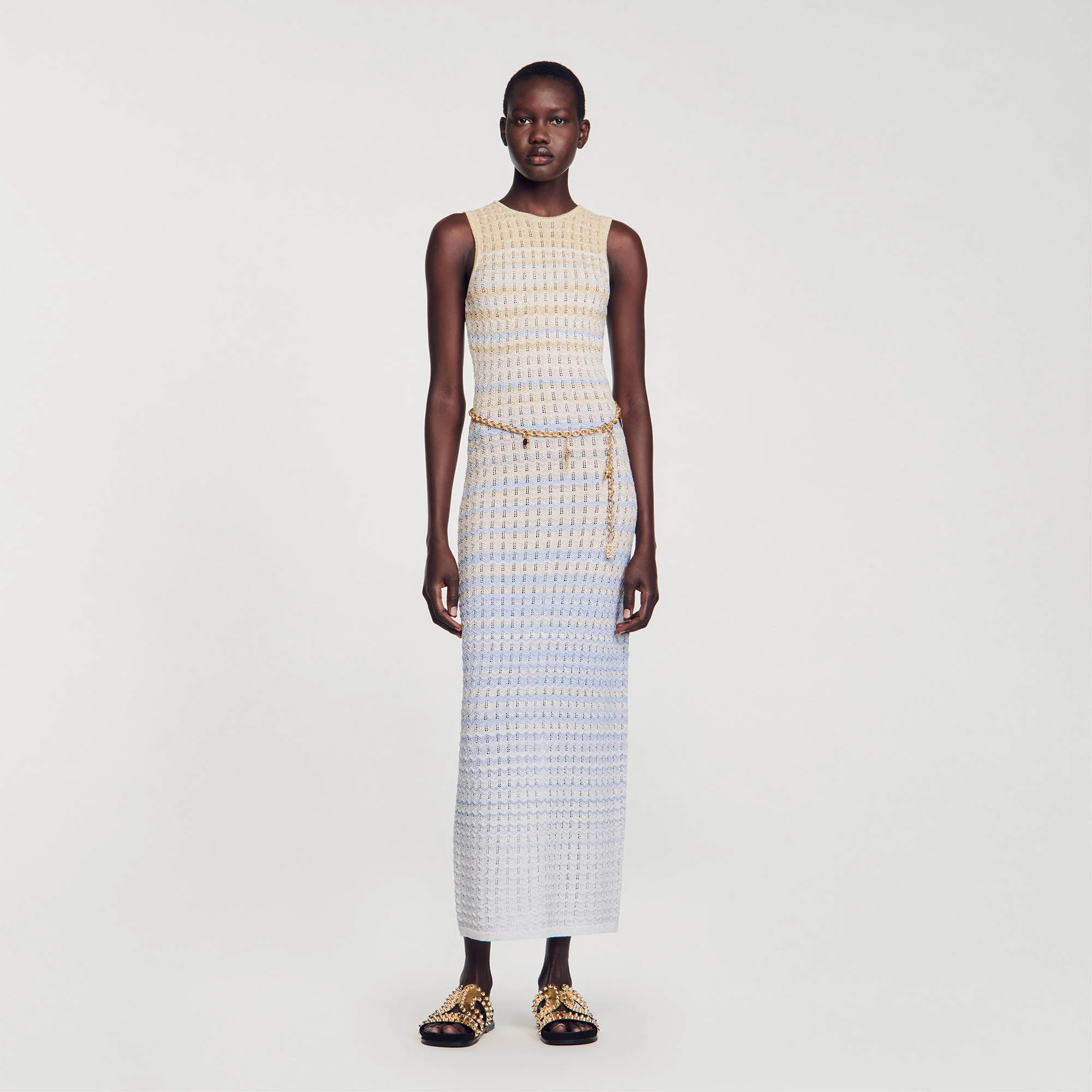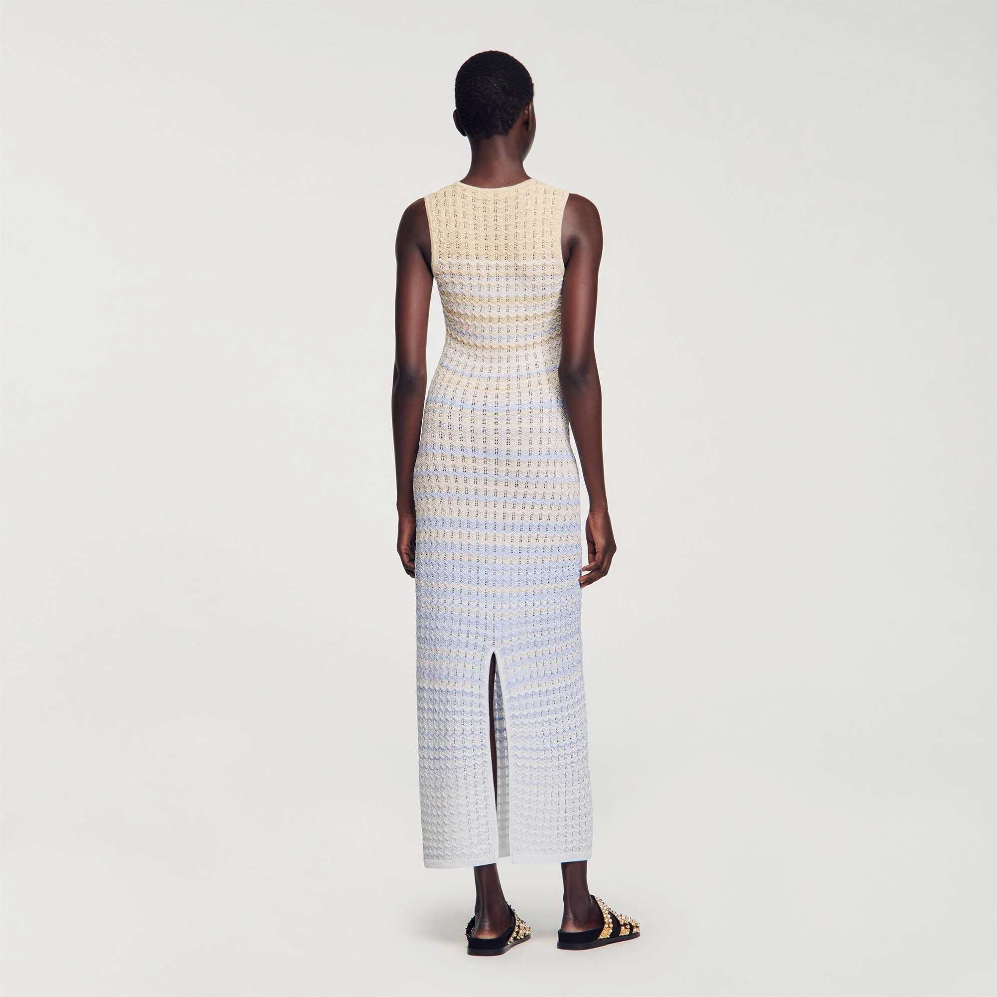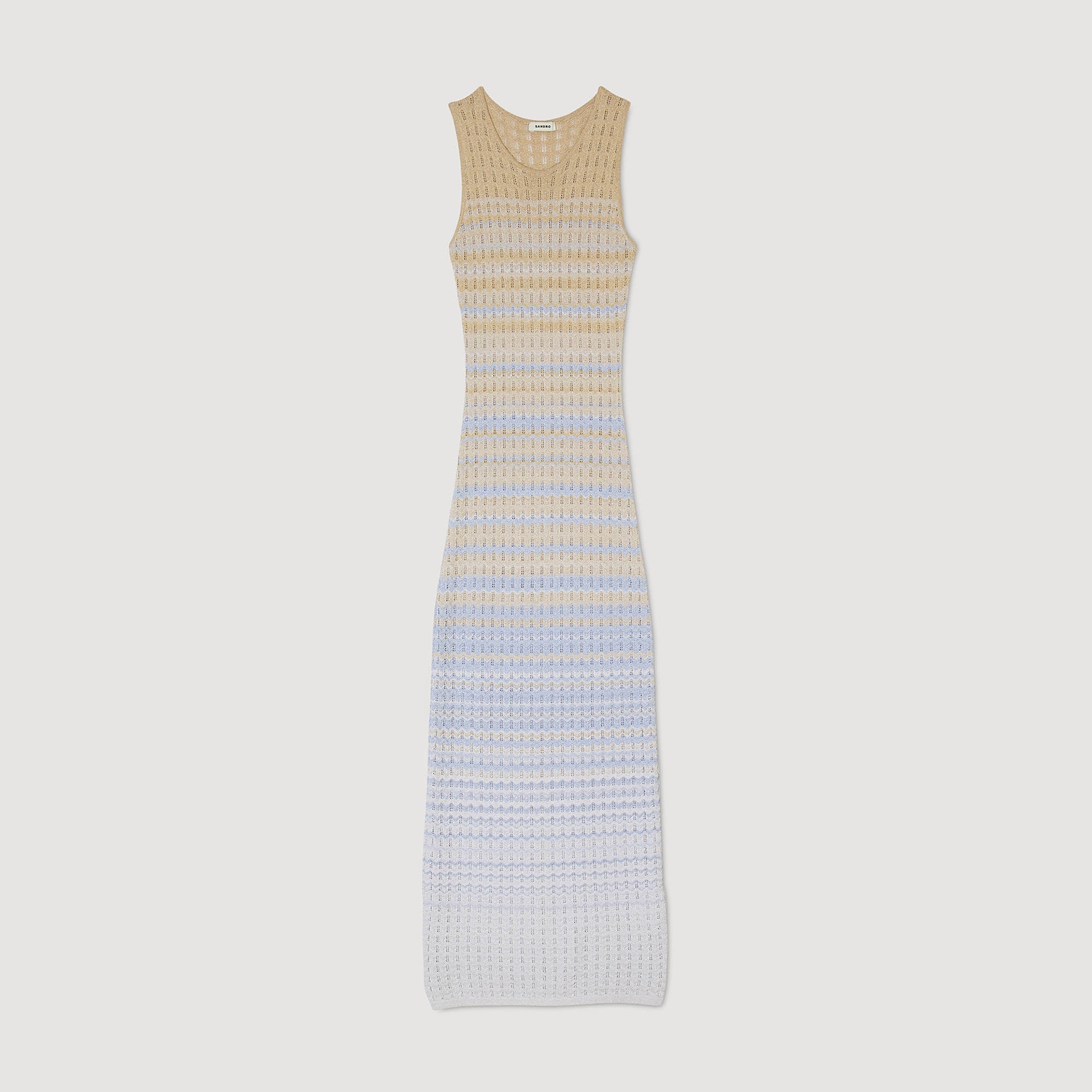 Vestido largo sin mangas de punto pointelle degradado con un cuello redondo.