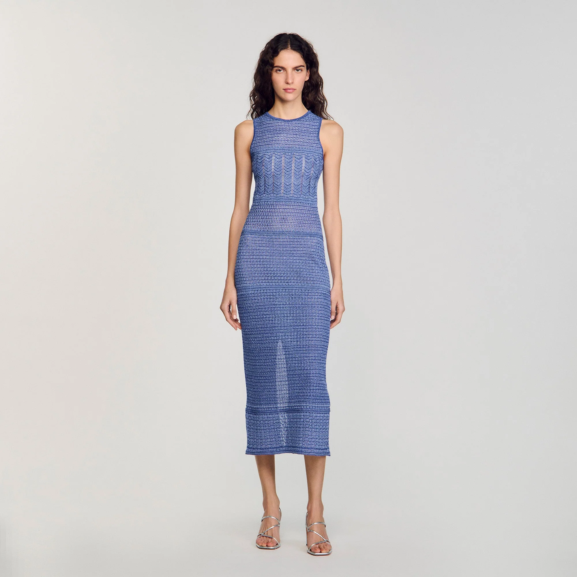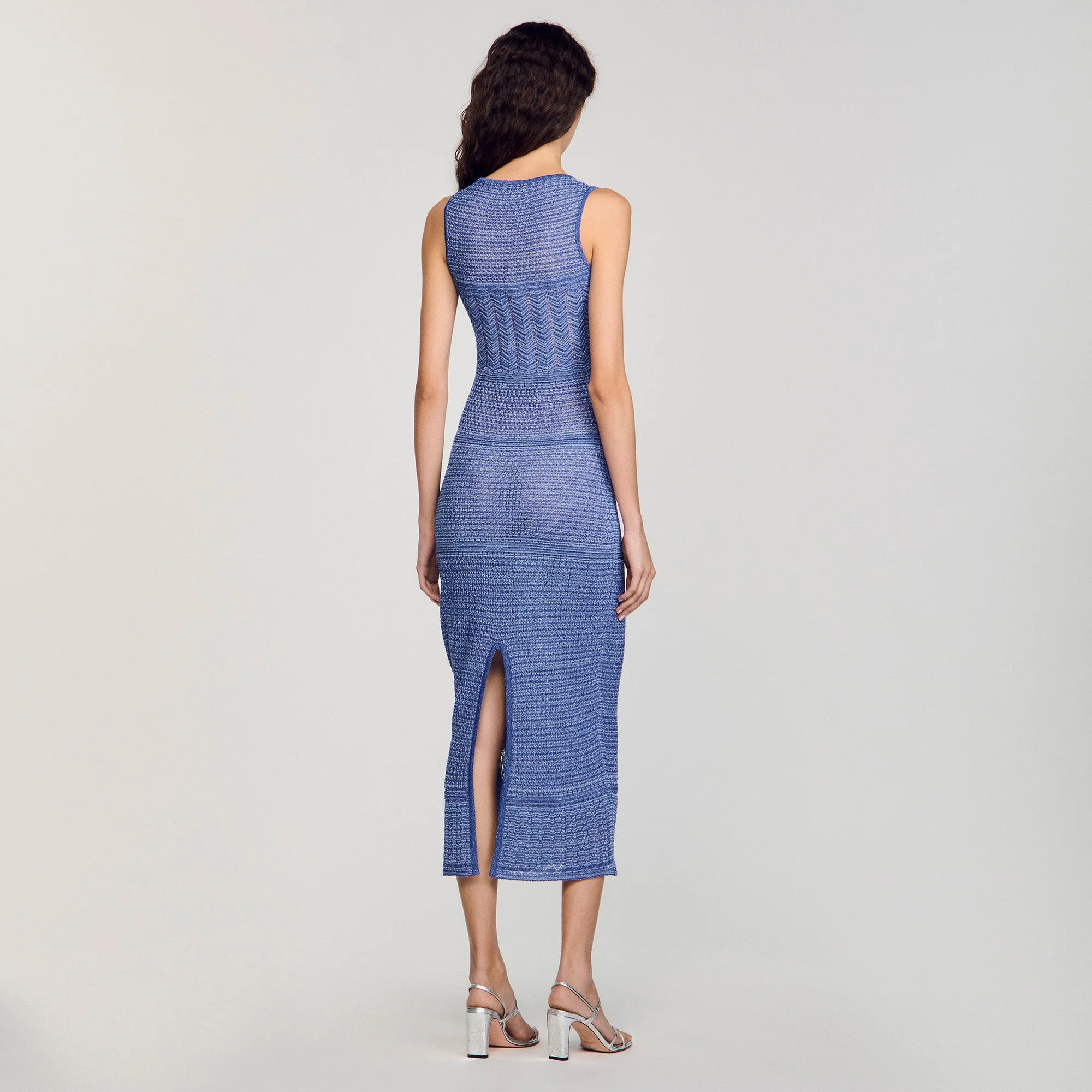 Vestido midi sin mangas de punto brillante con cuello redondo.