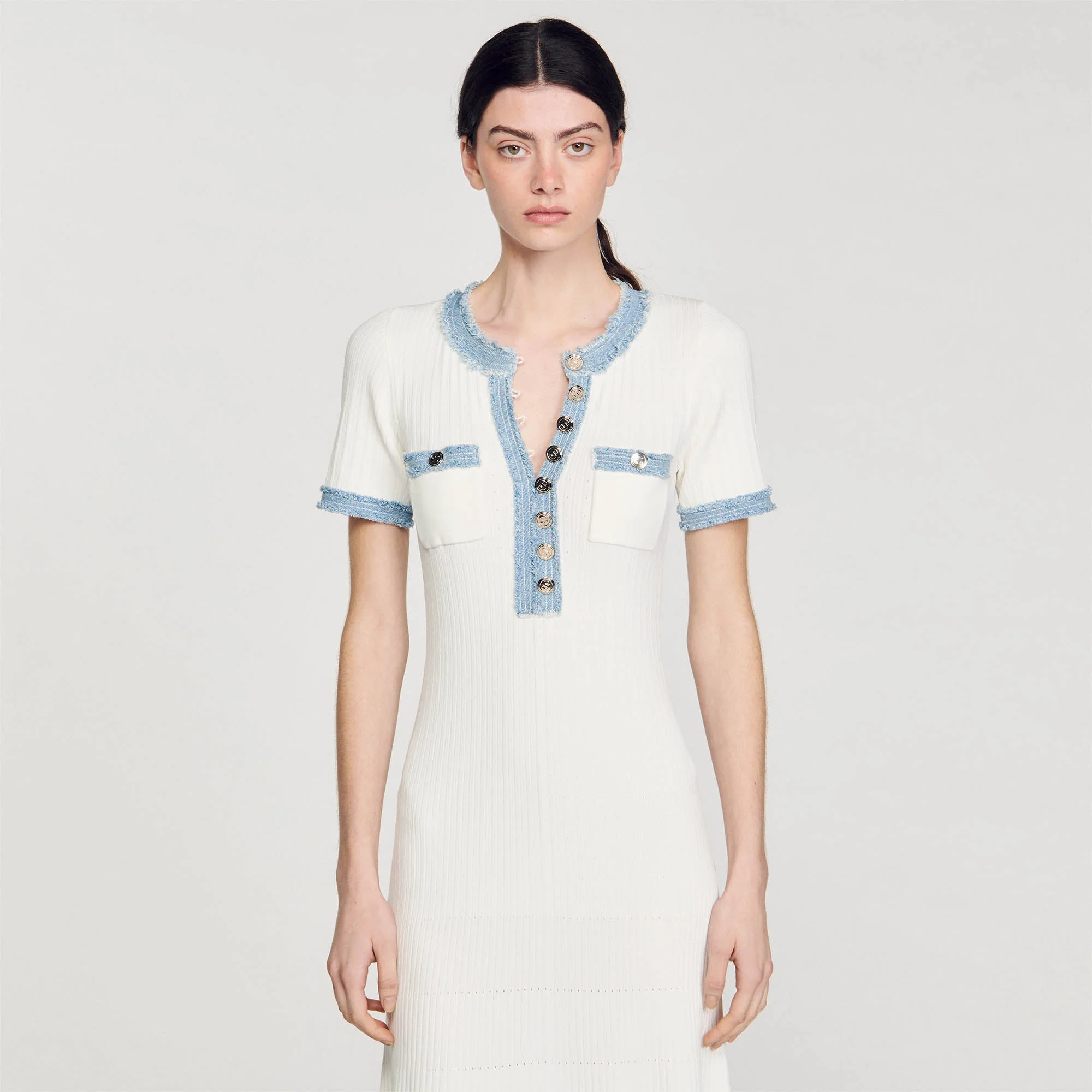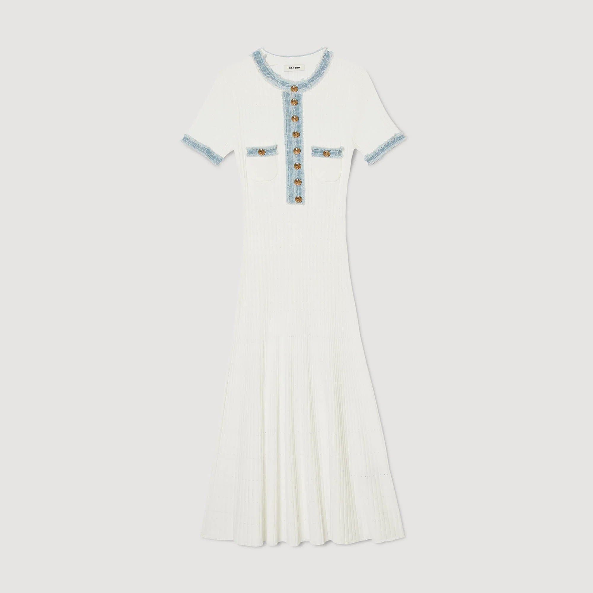 Vestido midi de punto de fantasía decorado con apliques de tejido denim deshilachado, con cuello redondo con botones, manga corta y dos bolsillos de parche en el pecho.