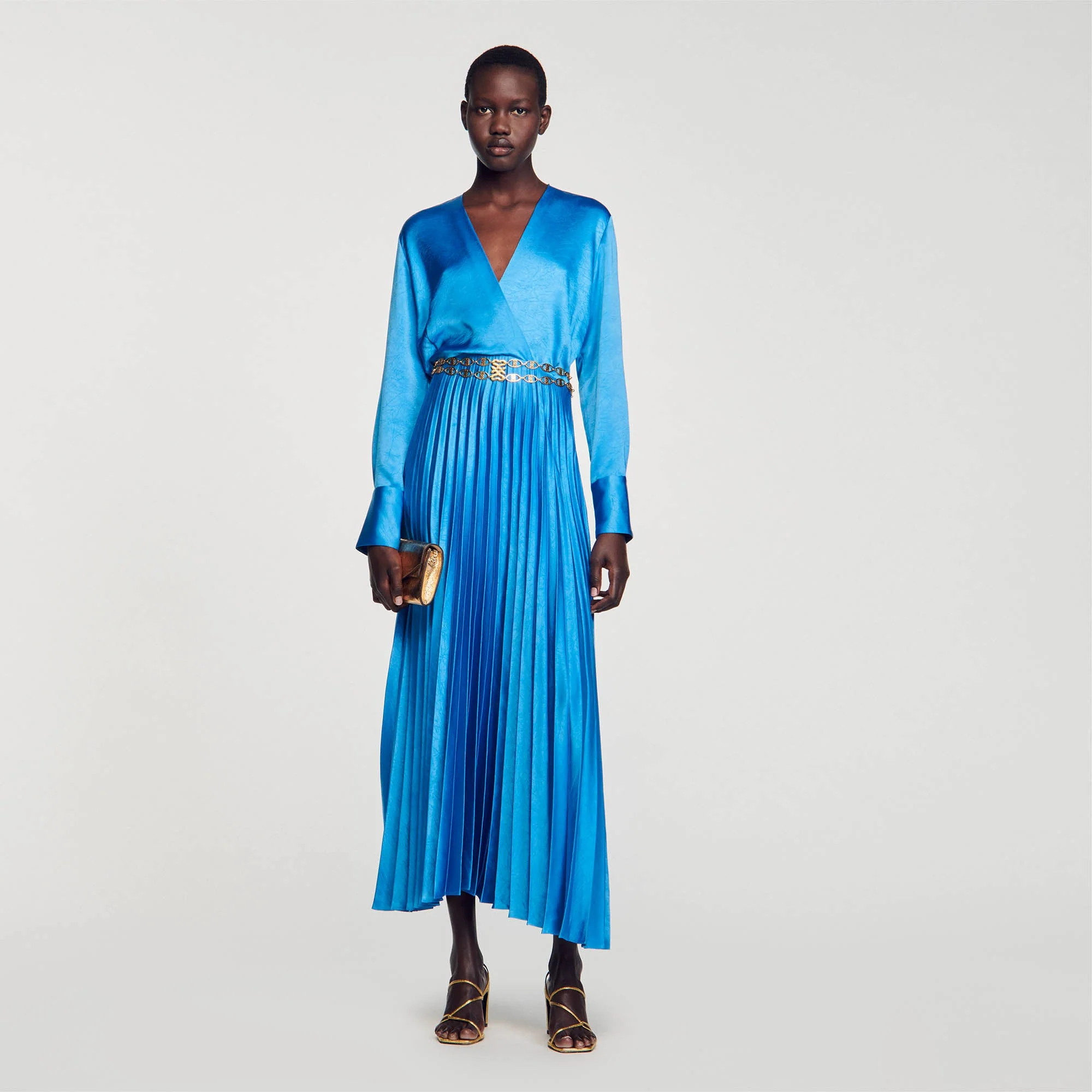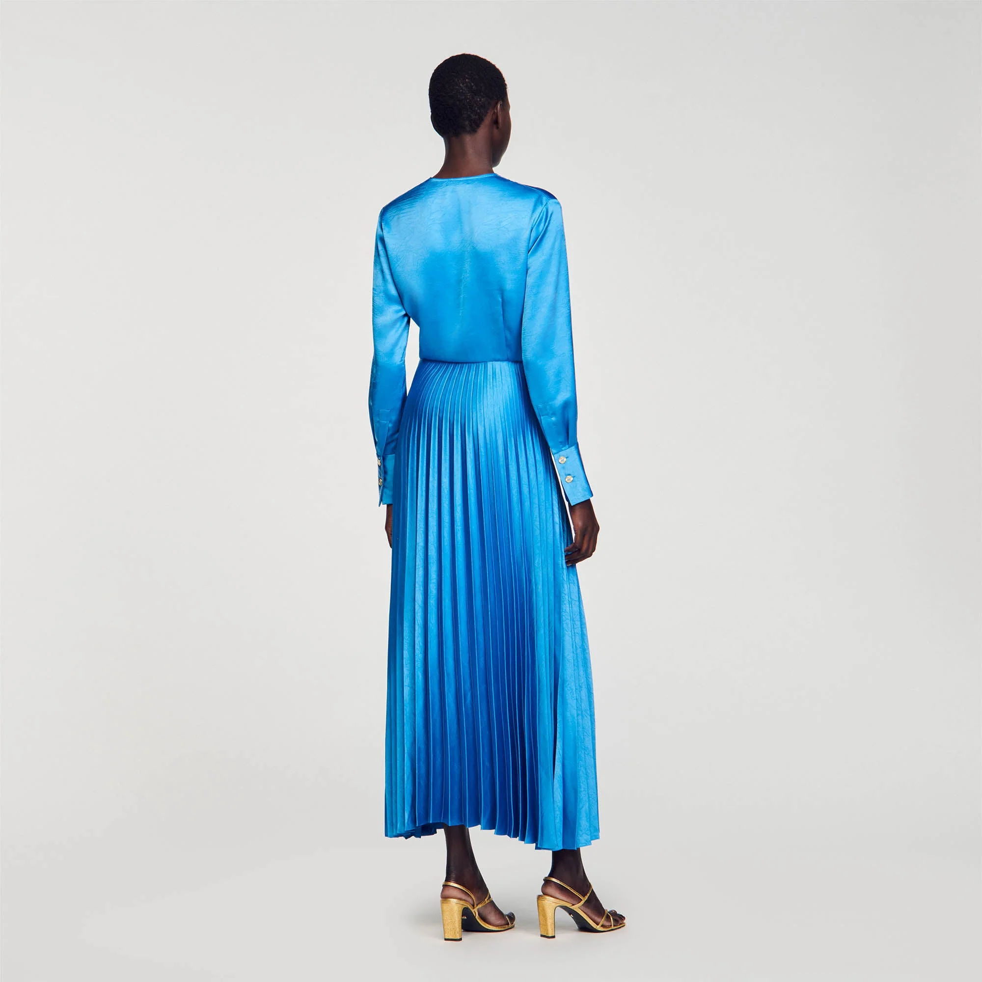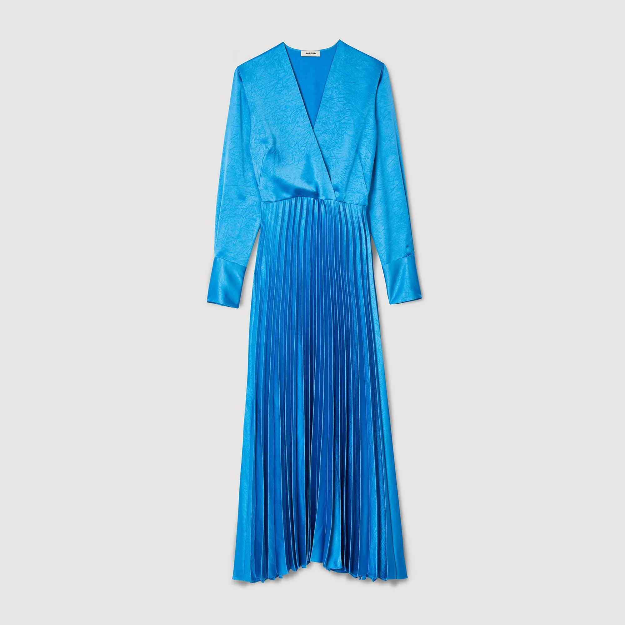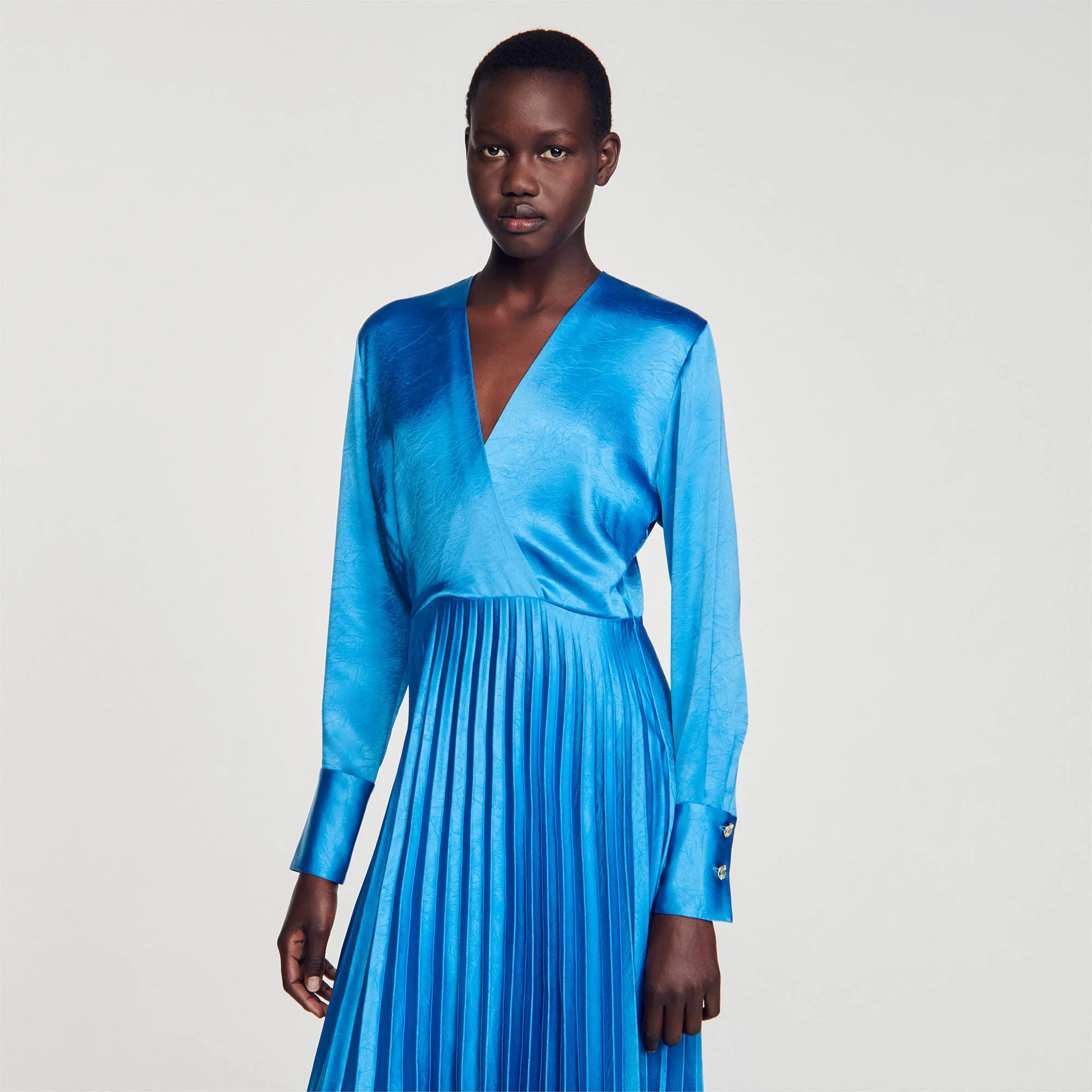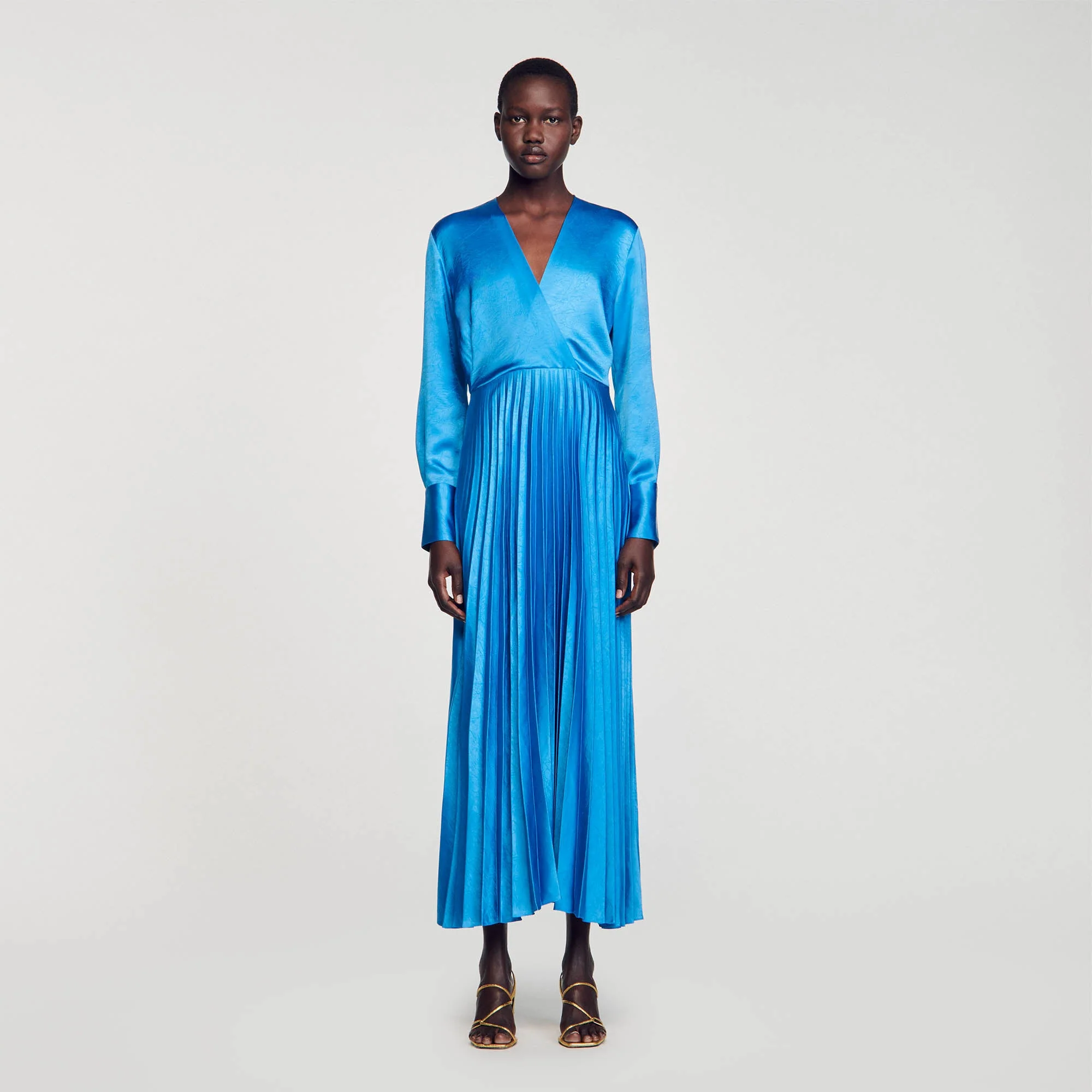 Vestido midi, fluido y satinado con escote de pico cruzado, manga larga con puño ajustado con botón de fantasía y falda plisada acampanada.