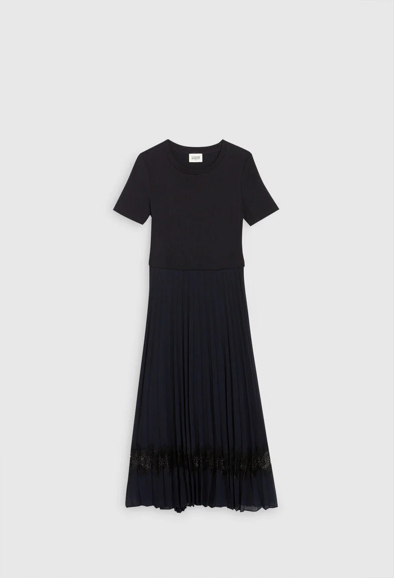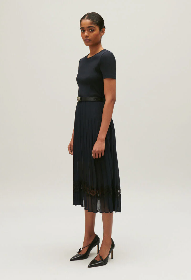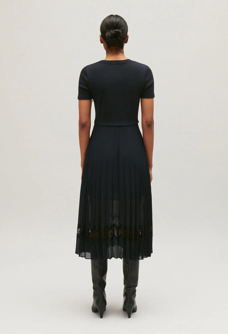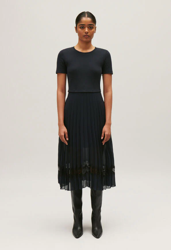 Falda plisada azul marino con encaje calado