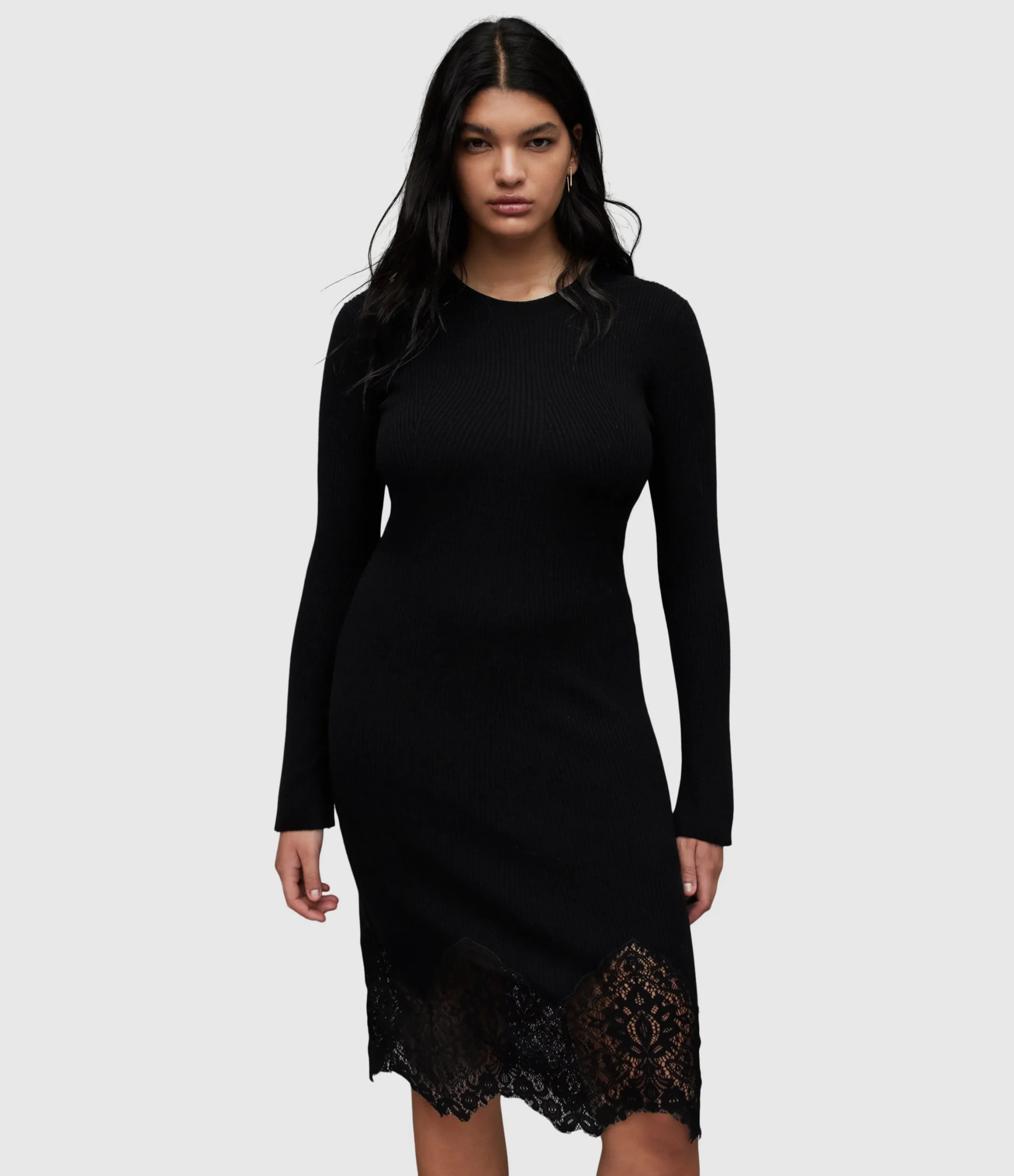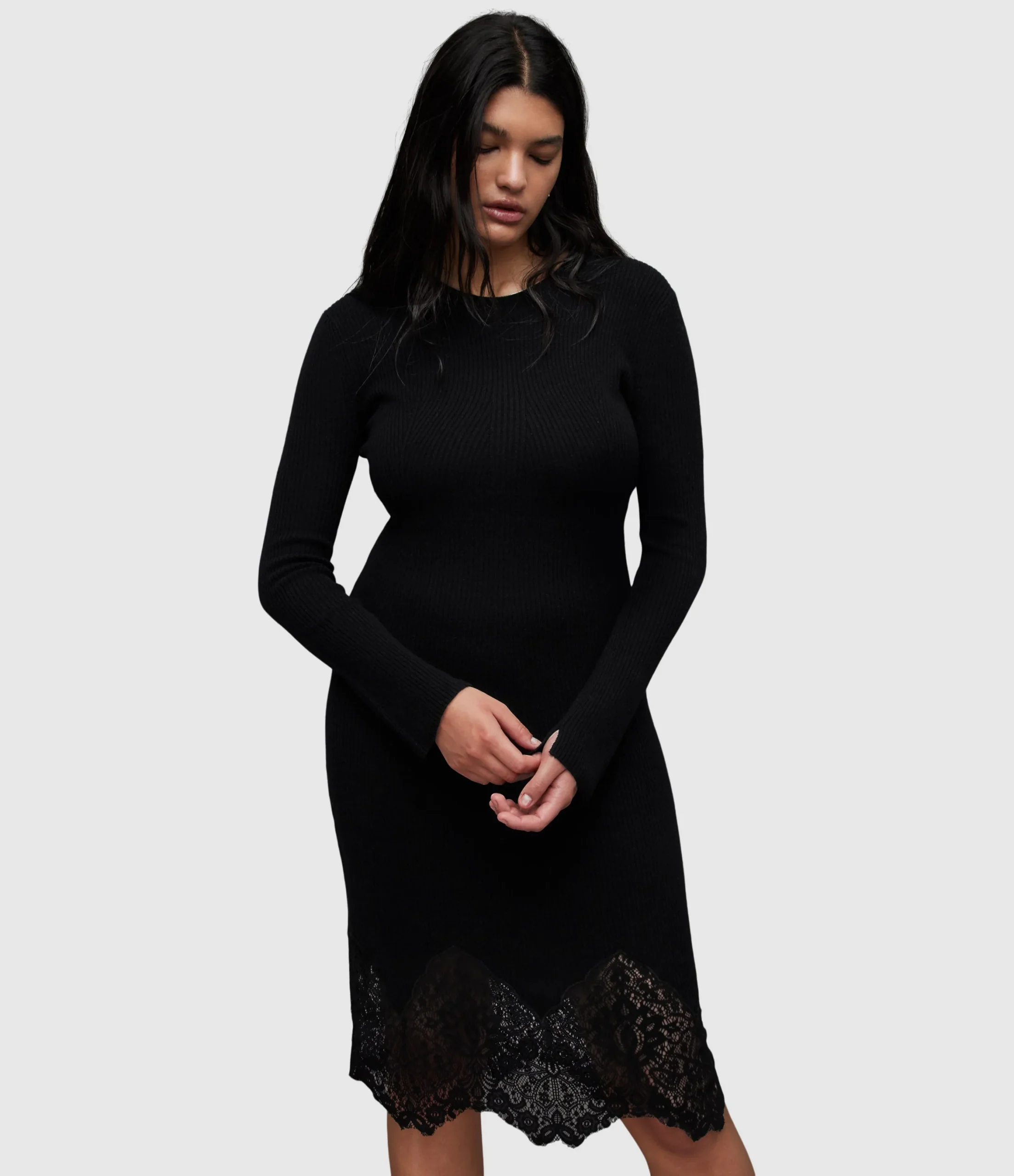 MILLY DRESS WD044Z BLACK SEP Pull over N/A N/A Regular fit Above the Knee Crew neck Long sleeve CREW NECKED, LONG SLEEVED MIDI LENGTH RIBBED DRESS KNITTED IN SOFT WOOL CASHMERE BLEND YARN. THE TOP HALF IS SLIM FITTING BUT THE SKIRT GENTLY FLAIRES TO BECOME ALINE AND FEATURES A DEEP SCALLOPED LACE INSERT DETAIL AT THE HEM WHICH CREATES A SHAPED HIGH LOW HEM. THE SLEEVES ARE LONG AND THE SLEEVES FLAIR SLIGHTLY AT THE WRIST. No Pockets N/A NO N/A Knitted Alpha 1 1