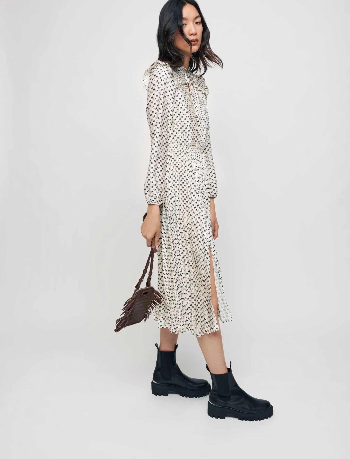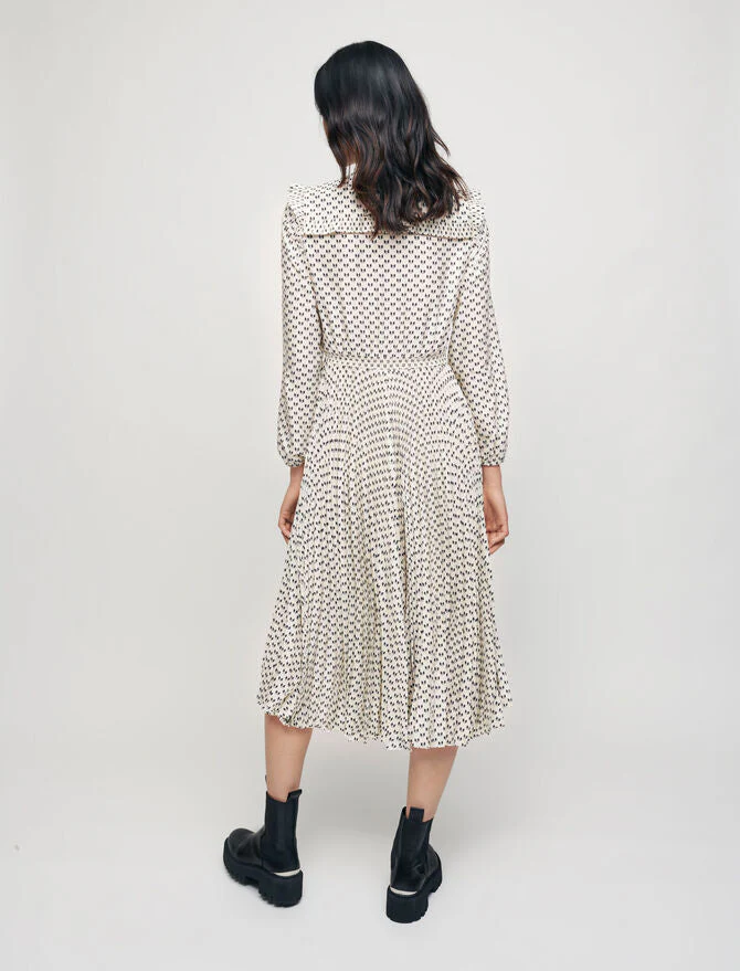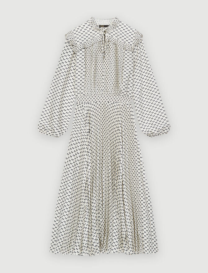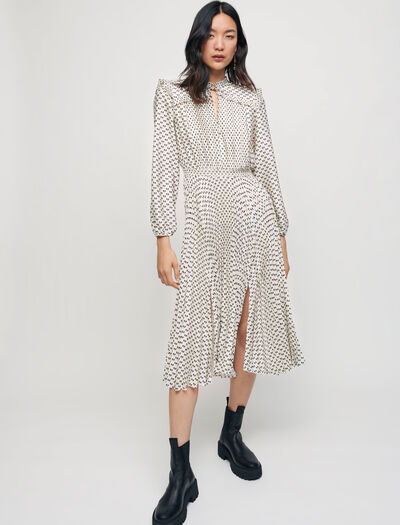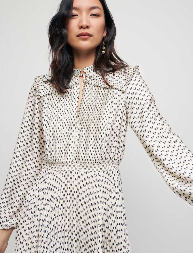 Vestido de largo medio fluido y entallado con falda plisada. Tejido satinado con estampado de lazos. Mangas largas y rectas ajustadas en el puño con una goma. Cuello alto plisado y escote cerrado con lazos. Detalle de volantes plisados. Cinturilla fruncida.