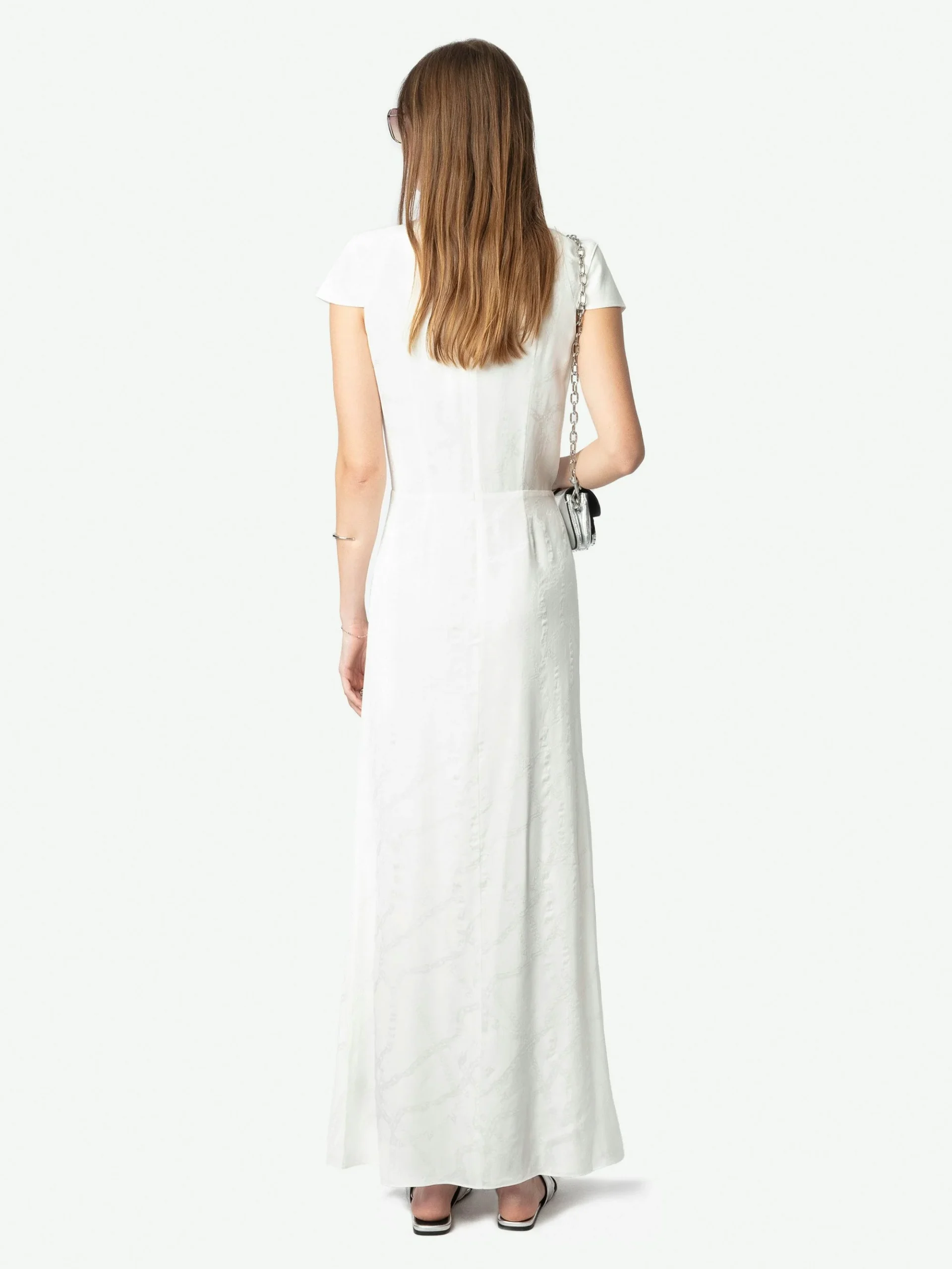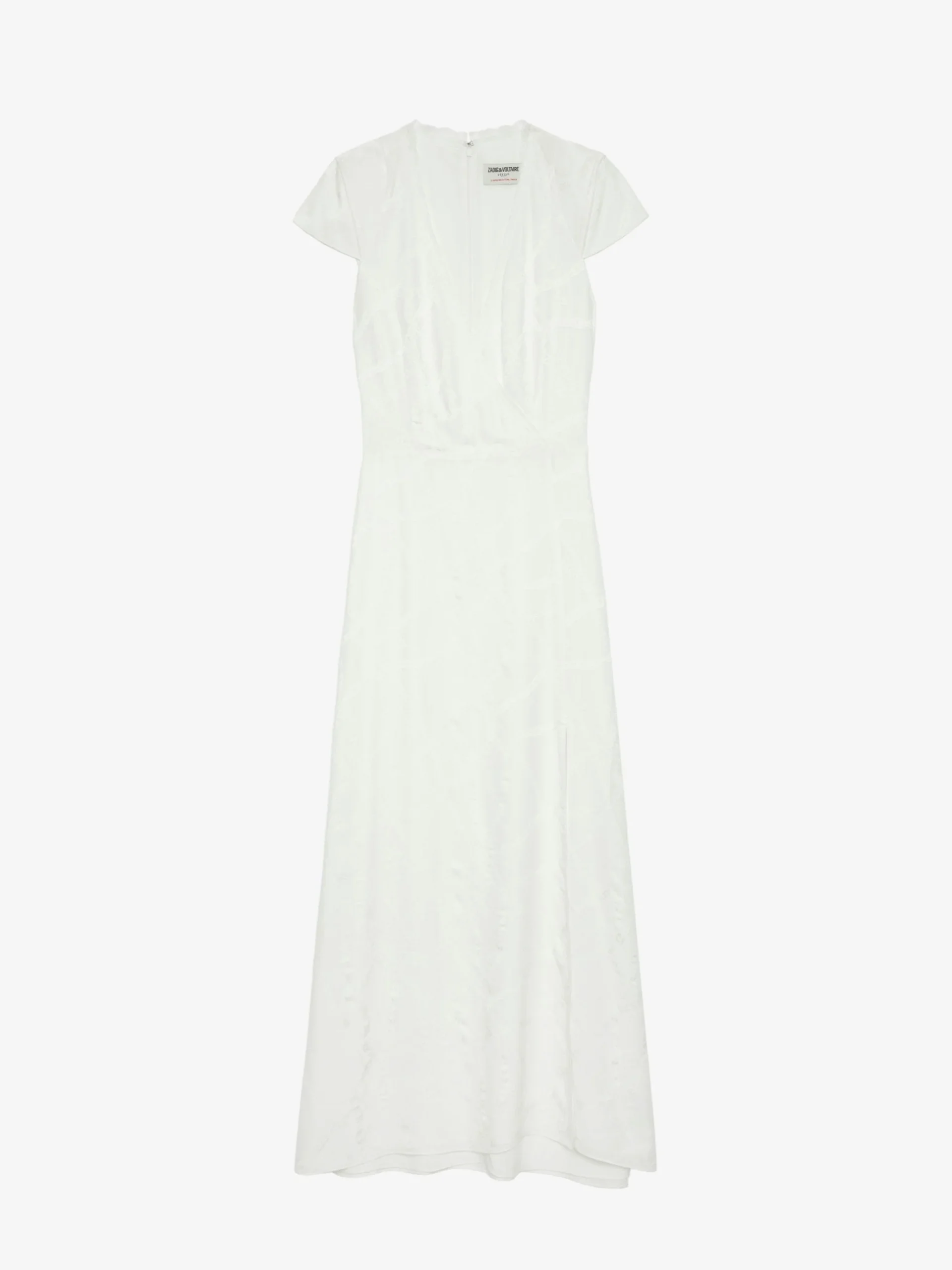 Vestido largo cruzado estilo lencería en seda jacquard, mangas cortas y encaje.