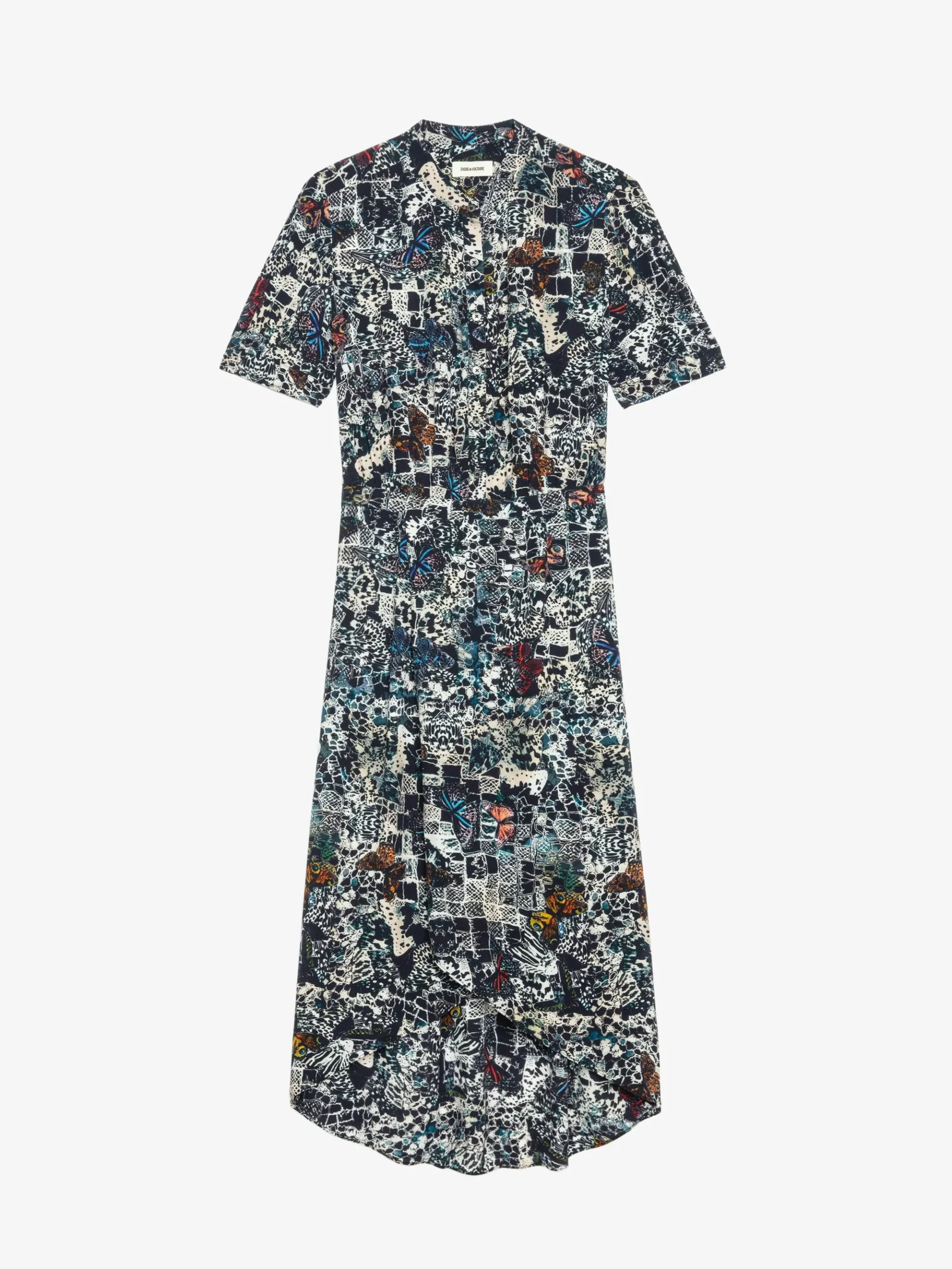 Vestido midi asimétrico y cruzado en viscosa estampada, con mangas cortas y escote abotonado.