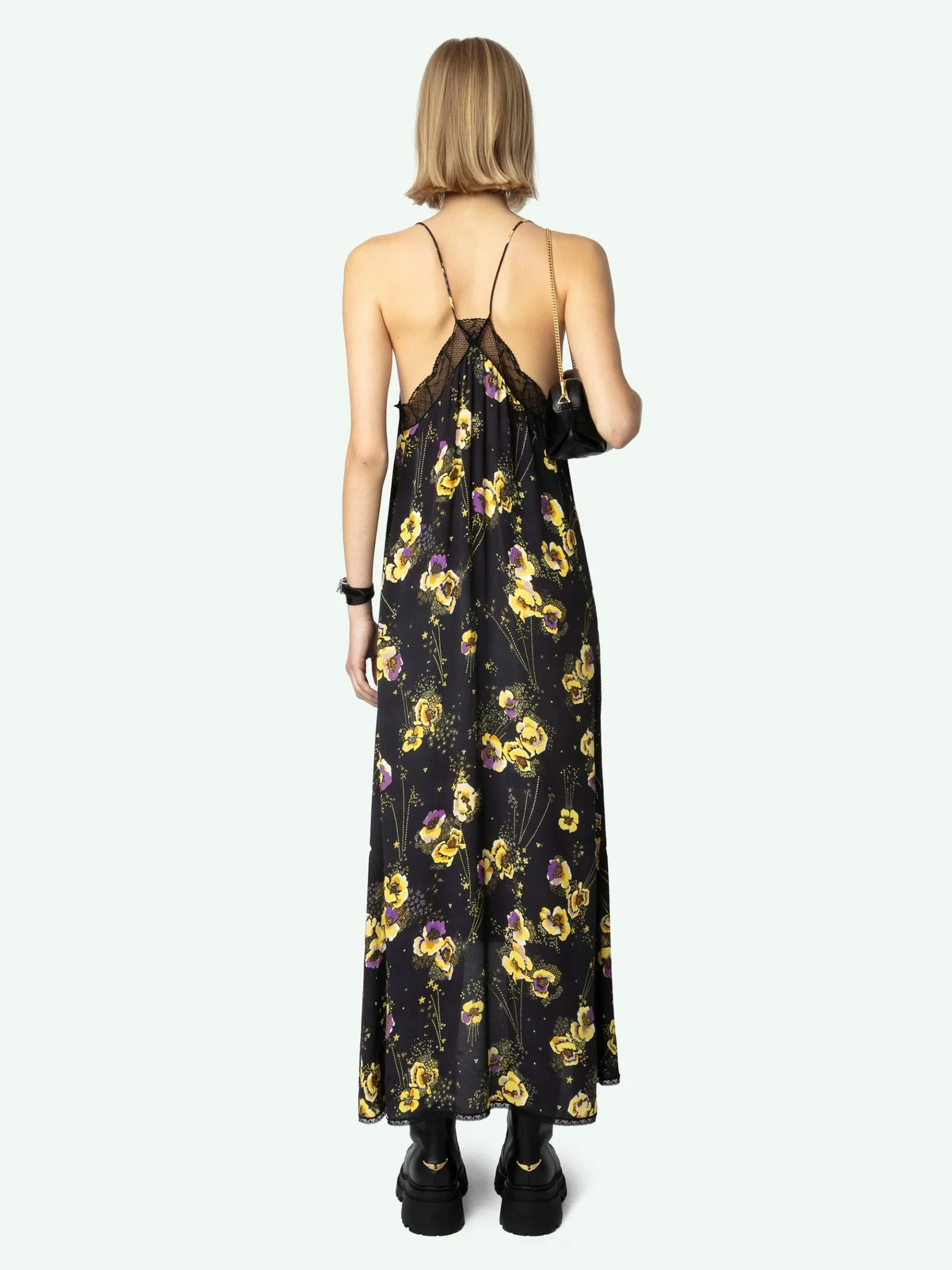 Vestido largo de estilo lencero de crepé negro con estampado floral Yoko, tirantes finos y escote de encaje.