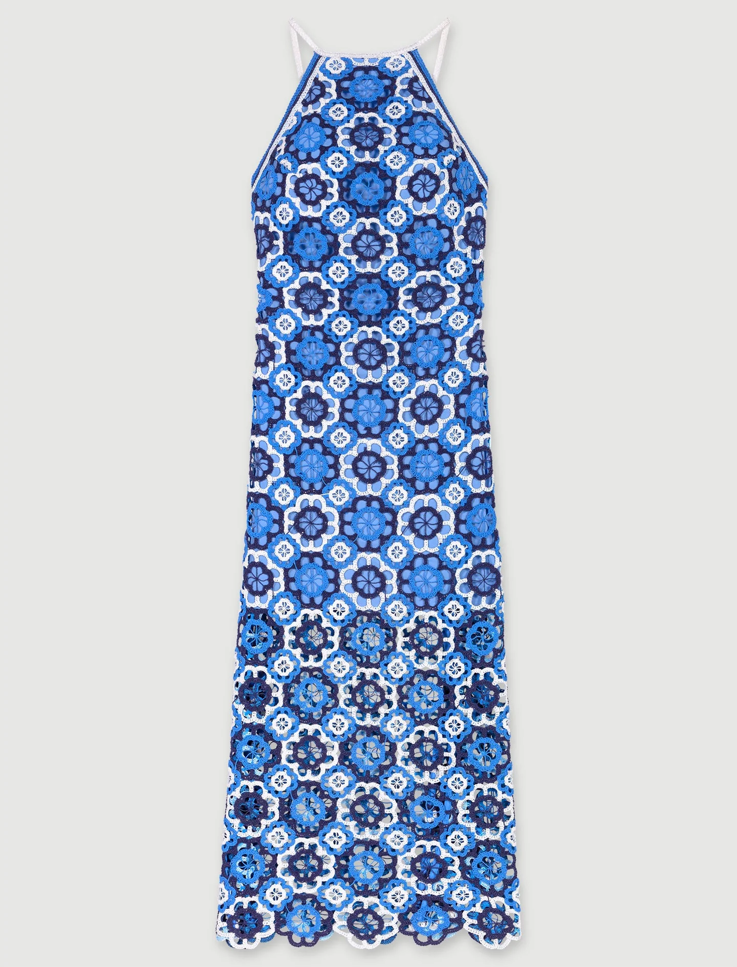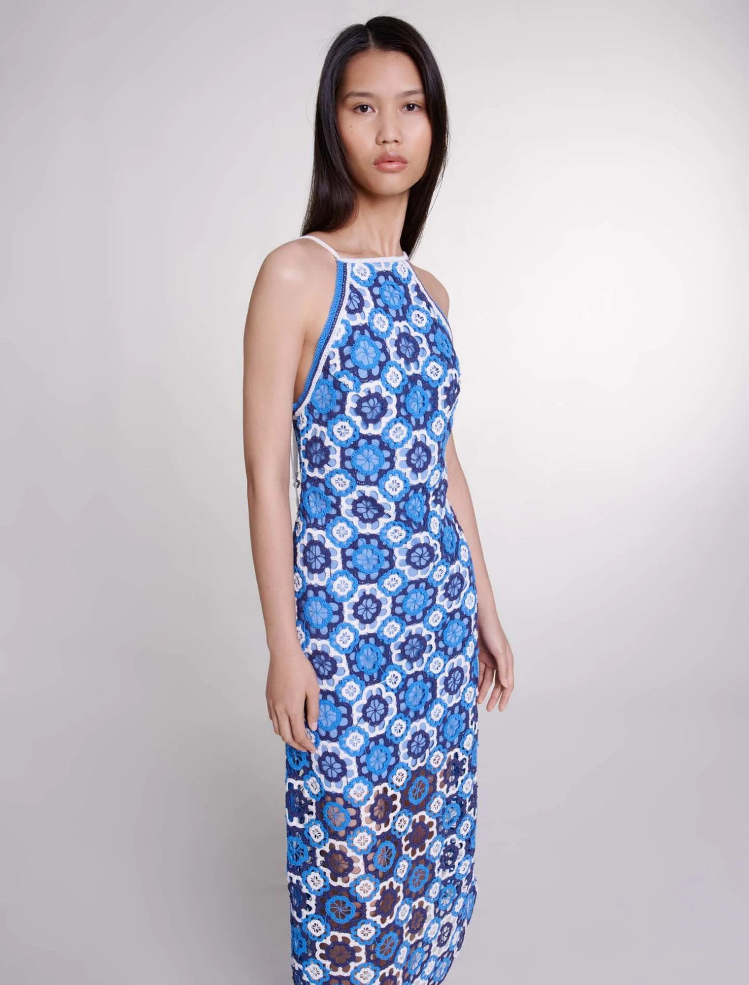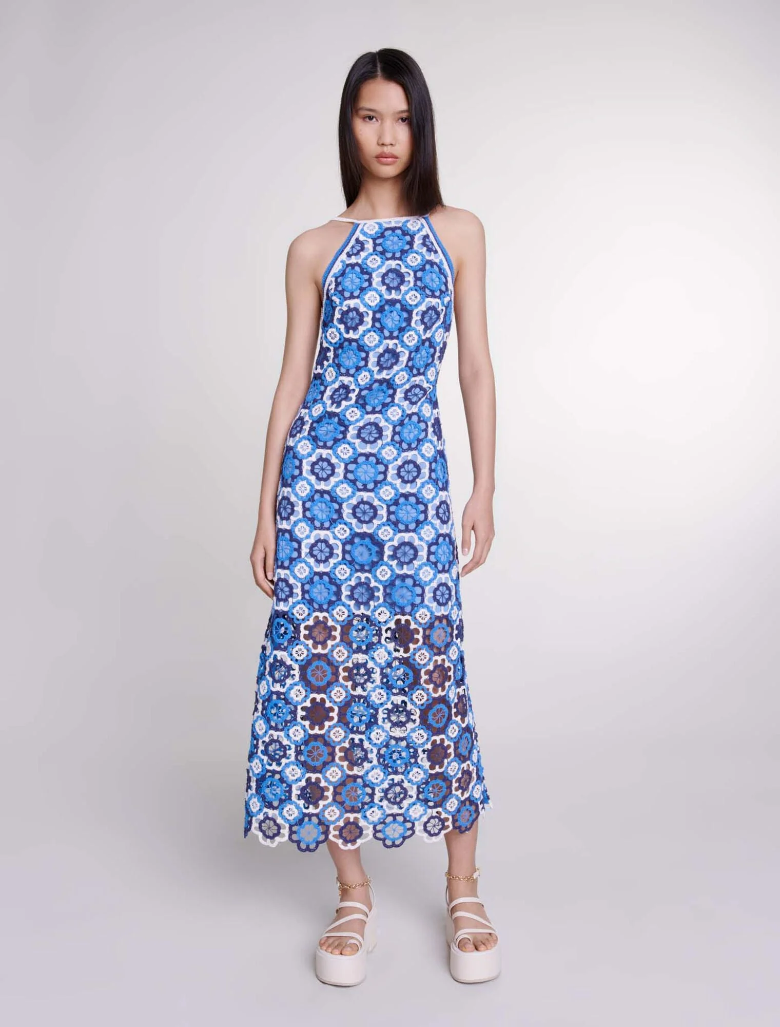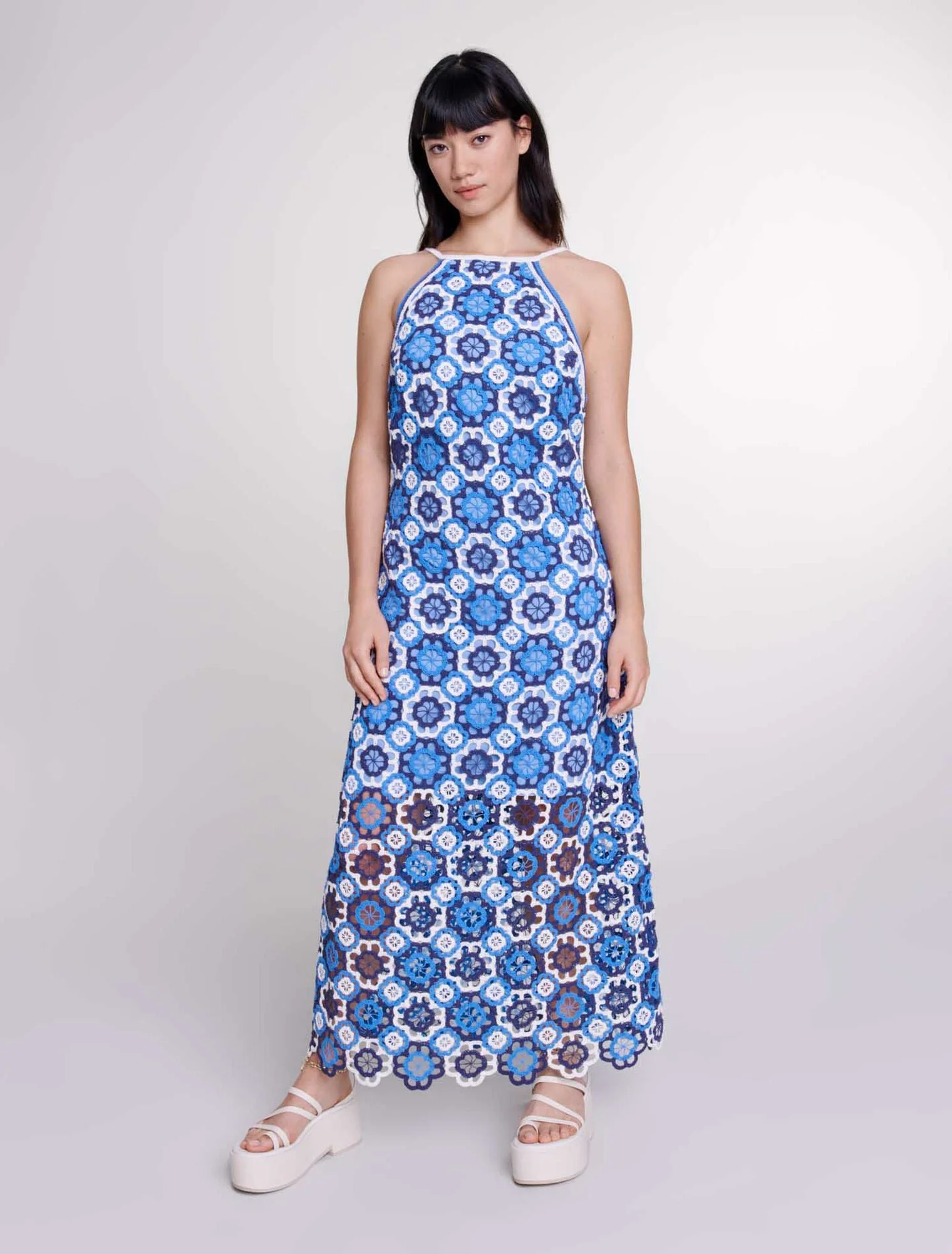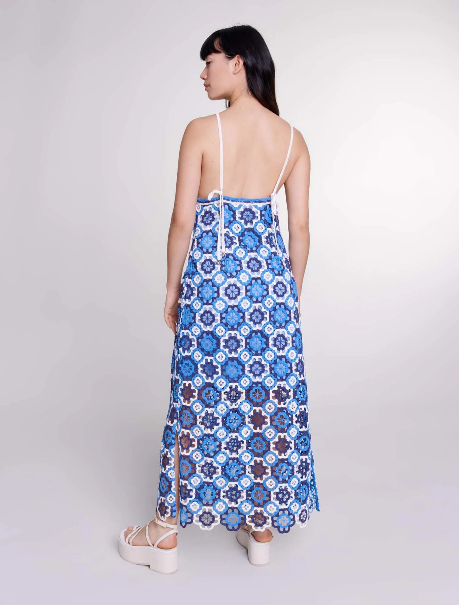 Decorado con tréboles contrastados en relieve, este vestido largo de ganchillo encarna la elegancia veraniega. Tiene sisas americanas y un cuello adornado con tirantes para anudarlos a la espalda, ofreciendo la posibilidad de llevarlo recto o cruzado, resaltado con colgantes plateados de trébol.Con un forro corto y un cierre de cremallera lateral, tiene un ligero escote en la espalda y una falda acampanada.Complete su atuendo con sandalias de plataforma para un «look» muy elegante y atrevido.Las modelos miden 176 cm y llevan una talla 36 y una talla 40.Referencia: MFPRO03574_0201