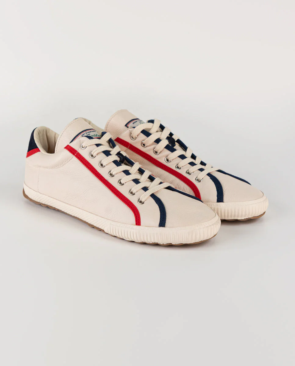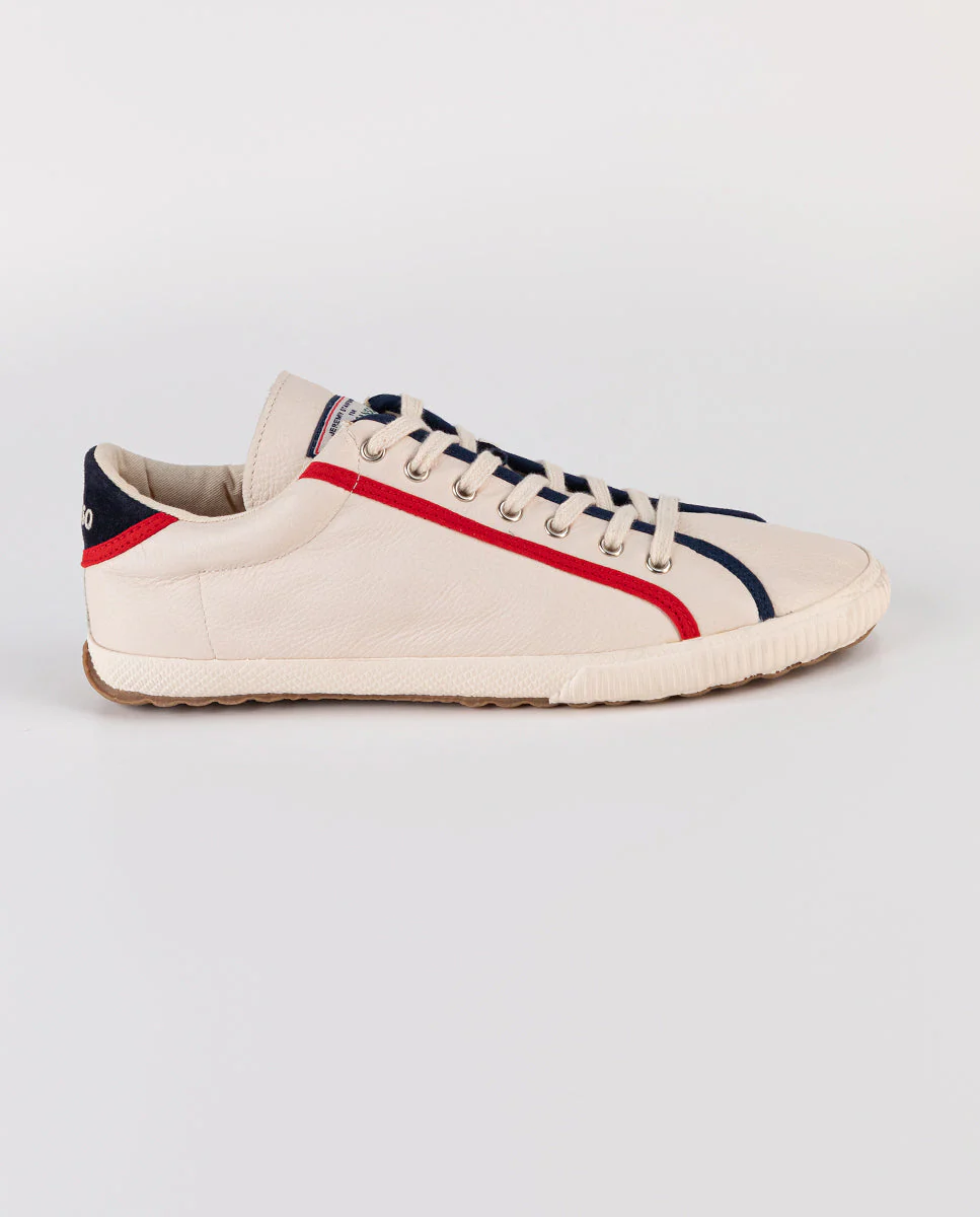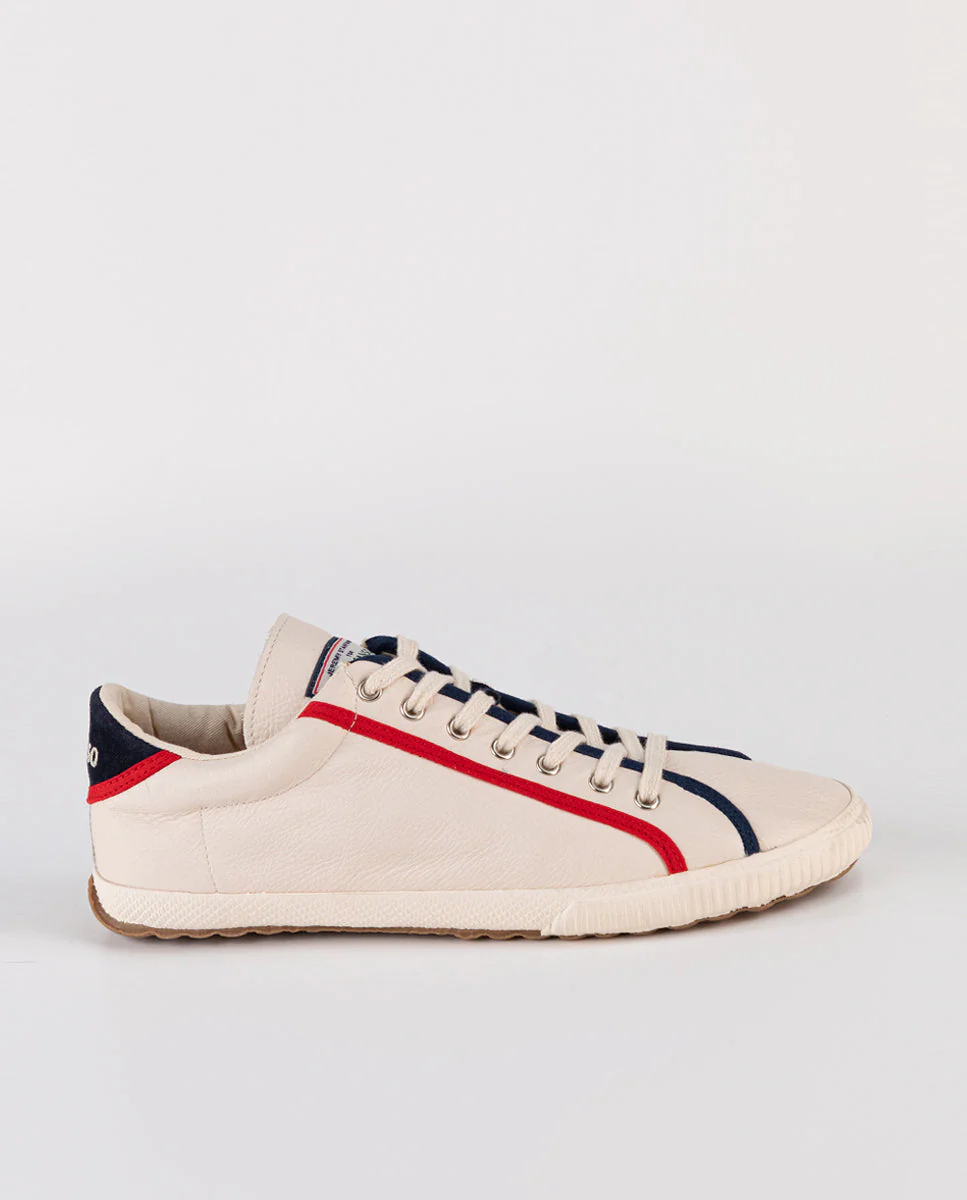 Zapatilla Unisex College en piel. Zapatilla lisa en color crudo detalle cinta a contraste en cordonera. Logotipo bordado en talonera a contraste. Cordones de color blanco.