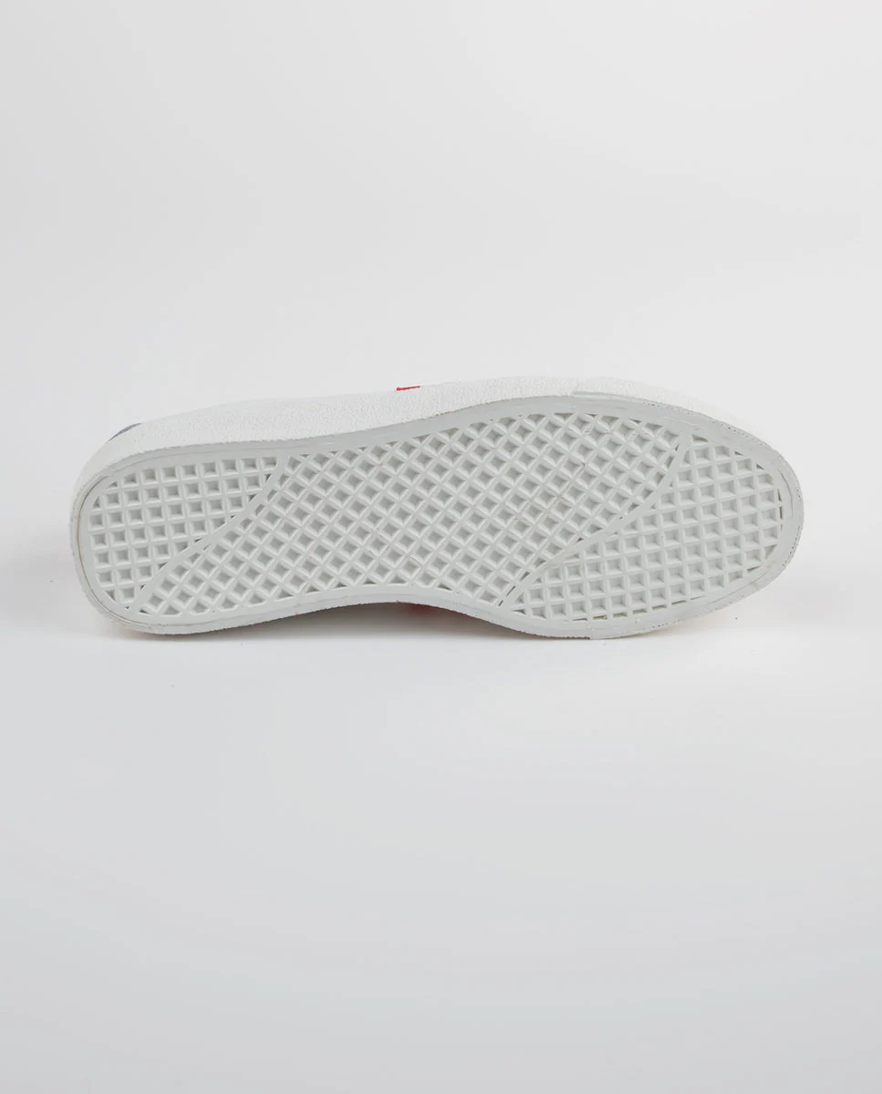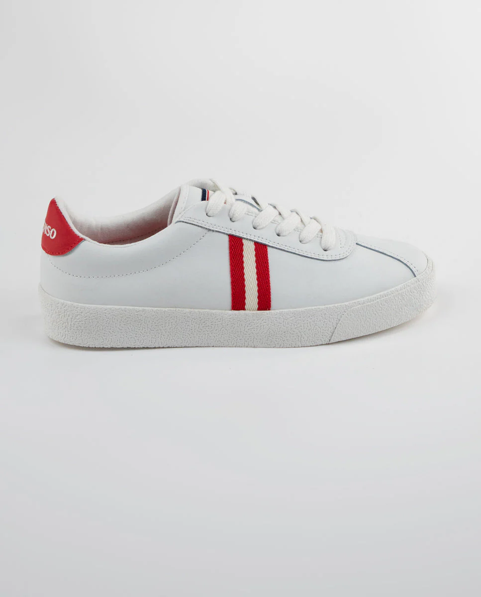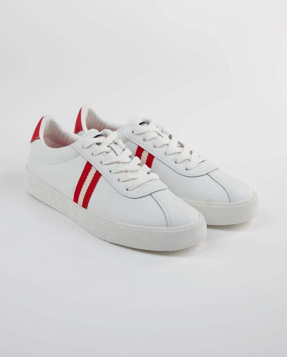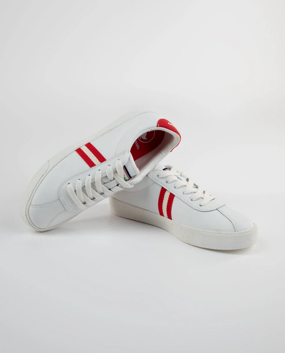 Zapatilla Low top piel blanca fabricada en 100% piel vacuno. Lleva suela de goma natural vulcanizada, cordones blancos y tiene nuestra clásica cinta de espiga a juego con la talonera de piel roja con El Ganso bordado. Plantilla de alta confortabilidad. Piel curtida utilizando prácticas más sostenibles.